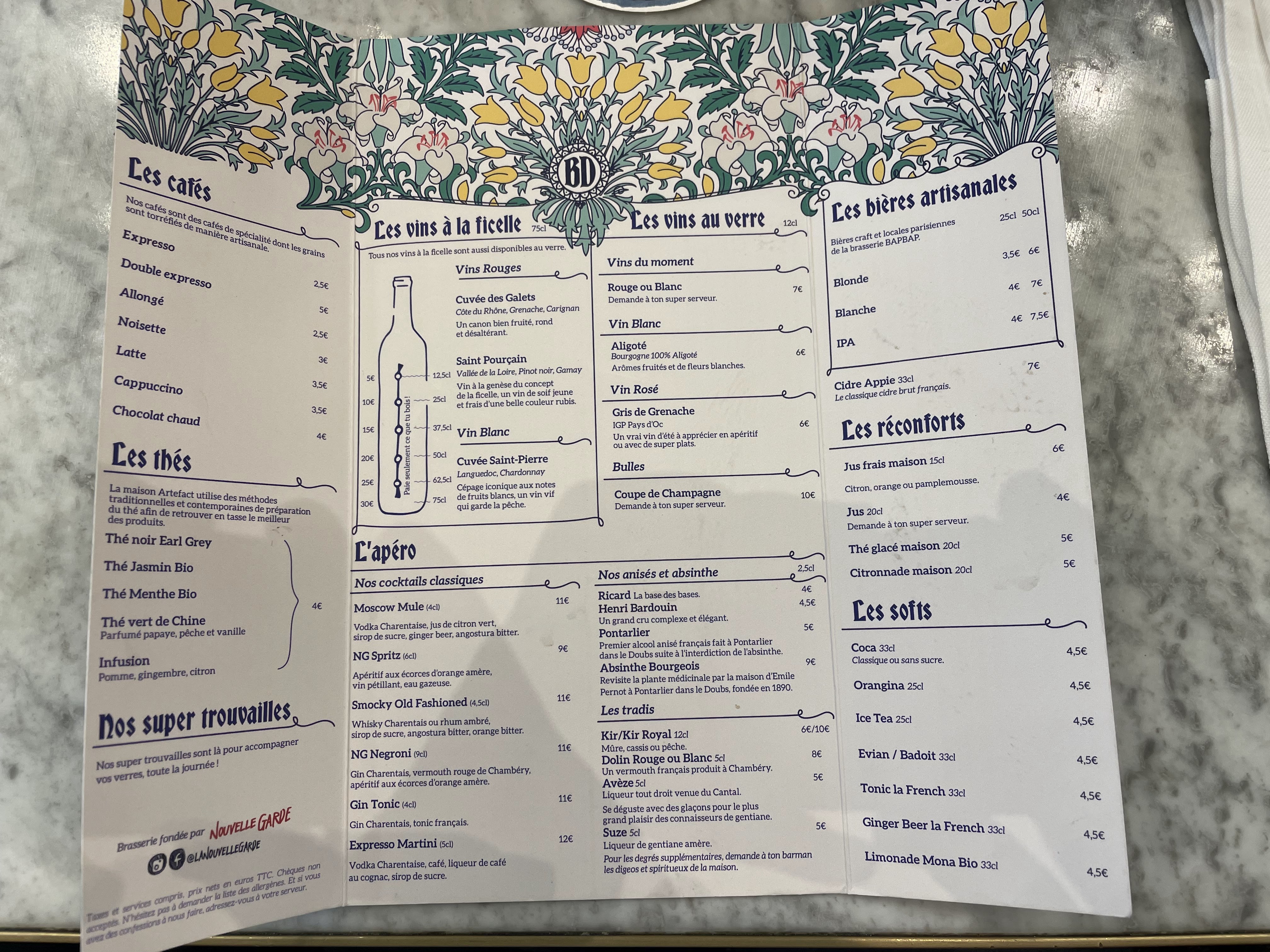 Comme d’habitude dans les brasseries de la Nouvelle Garde la cuisine était très bonne pour un pris très raisonnable ! Mais très déçue du service par rapport à la brasserie Bellanger que j’ai testé plusieurs fois: le service a été très long, pour prendre les commandes de l’apéritif au dessert et pour servir, une erreur de commande a été faite sur un plat (une bavette au lieu d’un plat végé) et le remplacement du plat a mis tellement de temps à arriver que nous avions déjà tous fini nos plats, et notre serveur n’était pas très aimable ni très réactif (il a fallu réclamer pour qu’on ouvre notre bouteille de vin, qu’on nous amène des verres à vin). Ça peut arriver mais dommage car ça nous a un peu gâcher le plaisir !