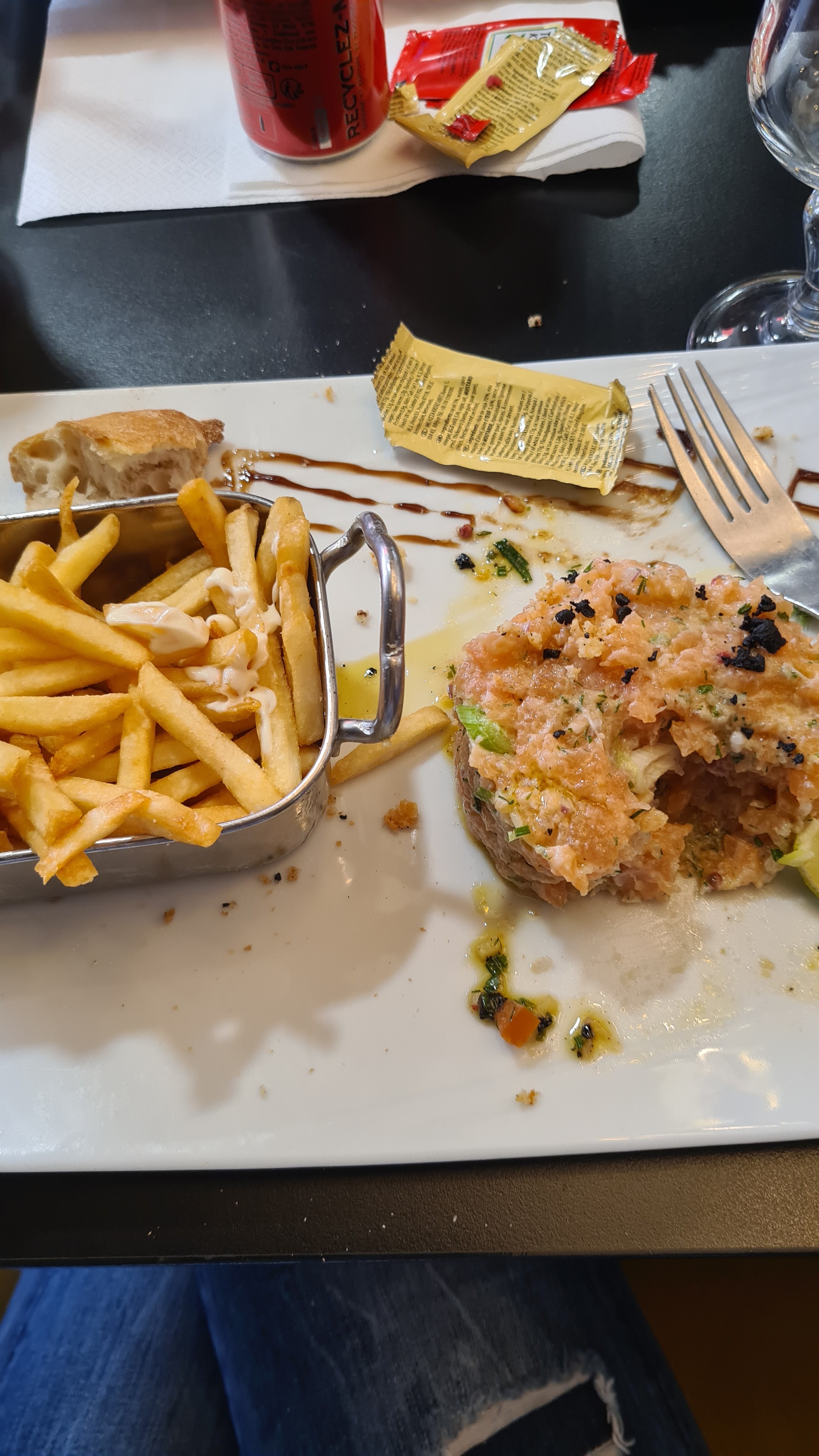 tartare de saumon frais à déconseillé très fortement ,Frais parce que la mixture devait sortir du frigo , produit gorgé d'eau , haché façon miette de crabe , j'ai sans doute eu droit a la dernière part du fond de seau ,aucune présentation , posé dans l'assiette avec une portion de frite , j'aurais mieux mangé dans un établissement scolaire . pas prêt d'y retourner Accueil et service rien a redire .....