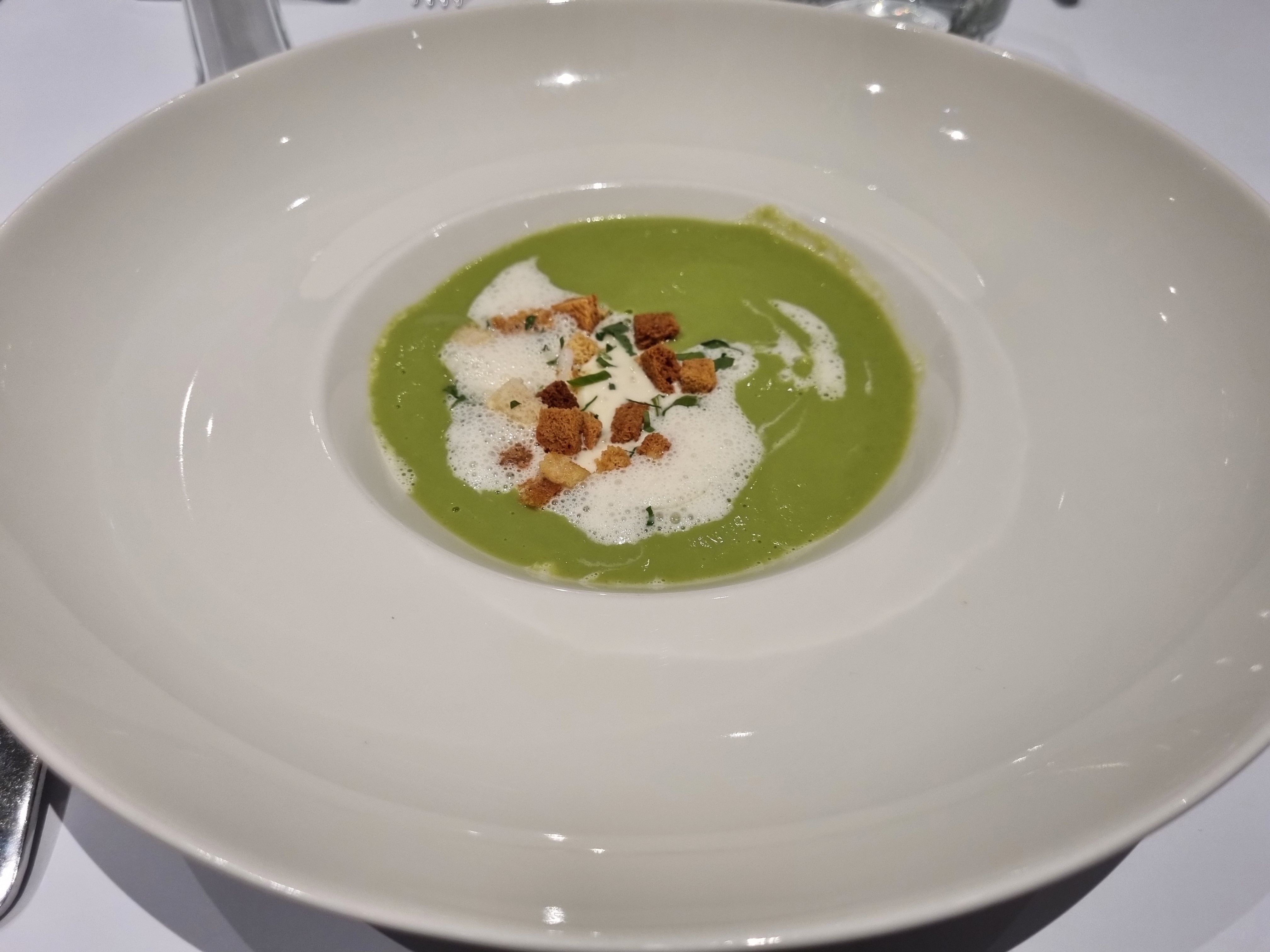 Personnel vif et au top(tous, même ceux non attitrés à notre table sont venus nous demander si tout allait bien, s'ils pouvaient quelque chose pour nous). Cuisine vraiment délicieuse : les légumes dans le velouté aux asperges étaient incroyablement assaisonnés. Bagel un peu plus fade mais bon avec ses pointes d'assaisonement autour, le lieu jaune avait une peau bien croustillante, avec un lit de pdt vraiment bien travaillé. Mon plat comportait du lard, j'ai demandé à ce qu'on le remplace par un second gâteau de pdt, on m'a à la place ramené une excellente purée. Apéro offert car on venait de la part de notre Airbnb (crémant et crème de cassis). Cuisine ouverte. Très belle terrasse et vue sur le lac, malheureusement, il pleuvait, donc... Bref, on en a eu pour 120€ en tout pour deux mais vraiment excellent sur toute la ligne. Ah et pour un anniversaire, ils ont sorti une machine qu'on peut voir sur une photo pour faire la musique d'anniversaire et on ramené une grosse bougie à étincelles (je ne connais pas les mots adéquats)