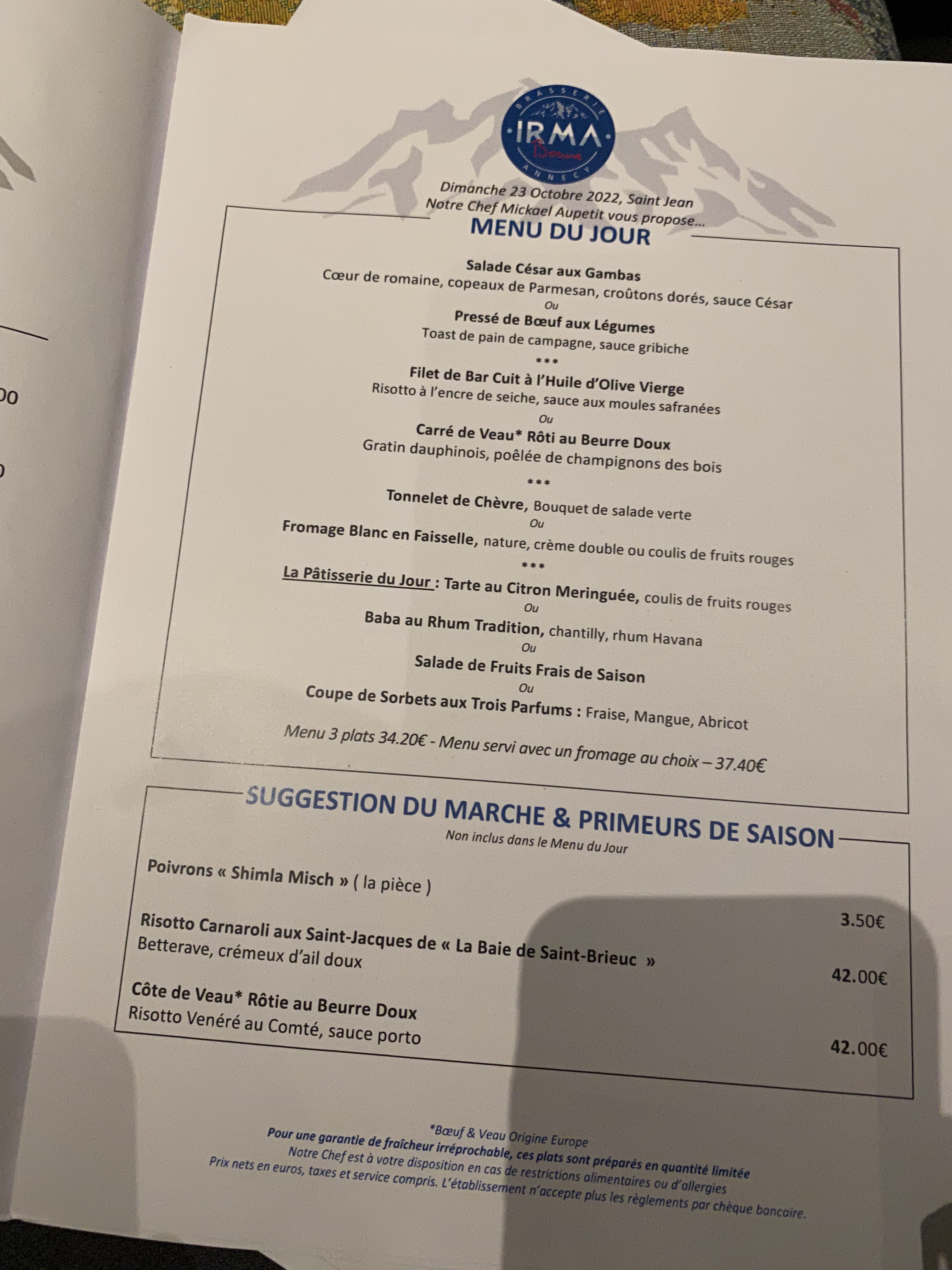 Nous avons passé un très bon moment à la Brasserie Irma. Nous avions choisi la formule du soir (entrée-plat-dessert à 34€) avec un apéritif et des cocktails. Tout était très bon, les chefs nous ont régalés avec des plats de qualité. Nous y sommes allés dimanche soir, donc il n’y avait pas beaucoup de monde, mais je recommande de réserver à l’avance sinon vous risquez de ne pas pouvoir y manger. Je recommande cette brasserie.