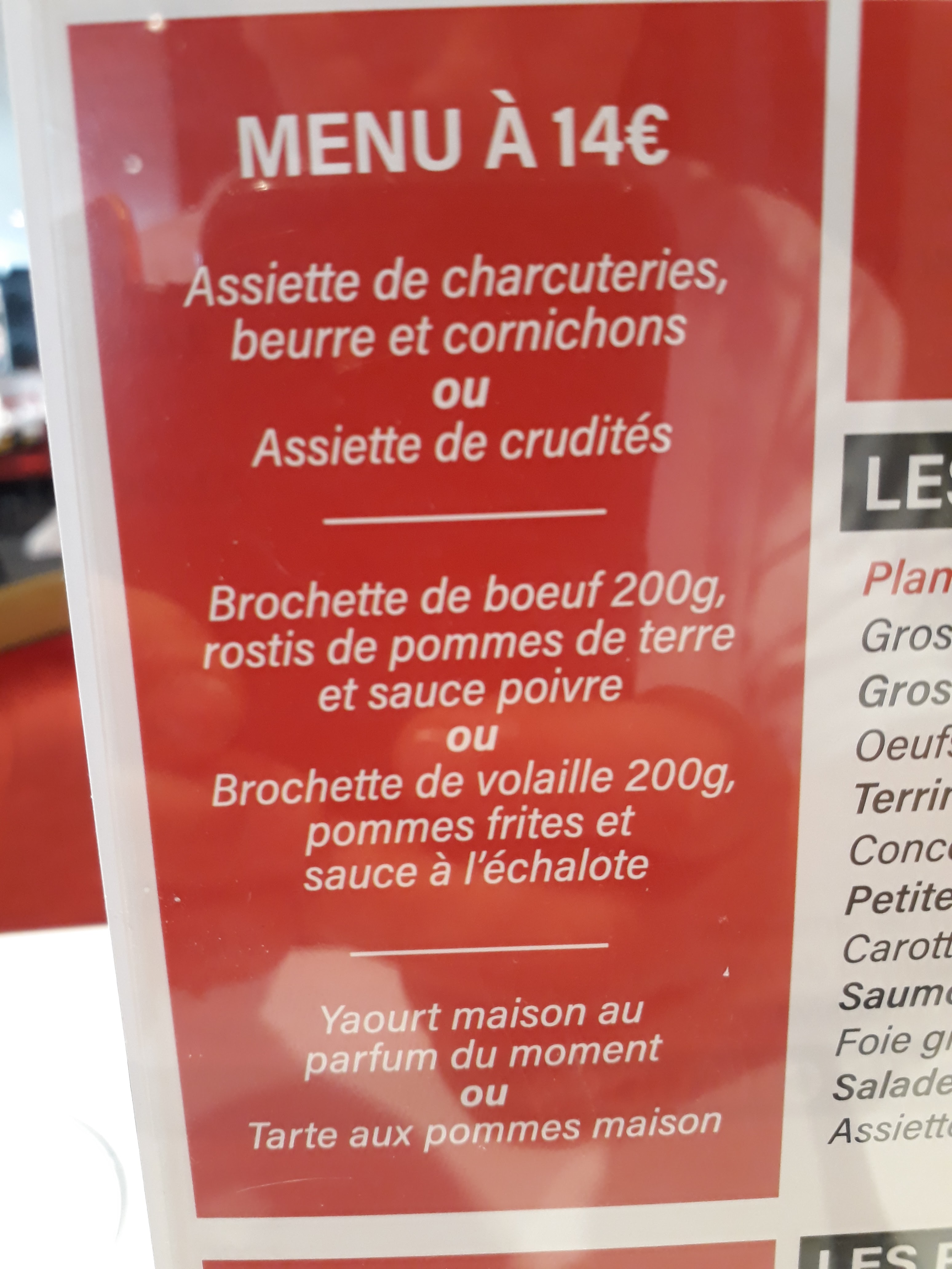Salle claire, spacieuse et agréable. Mais, Pâté quelconque, confis d'oignons insipide, brochettes froides, dures et filandreuses(agneau et boeuf) Purée de carottes froide, Pommes de terre froides, même si les assiettes sont chaudes! Le tout sortant directement du four à micro-ondes. Le dessert accompagnant le menu n'a pas été servi. Restaurant à éviter, absolument!