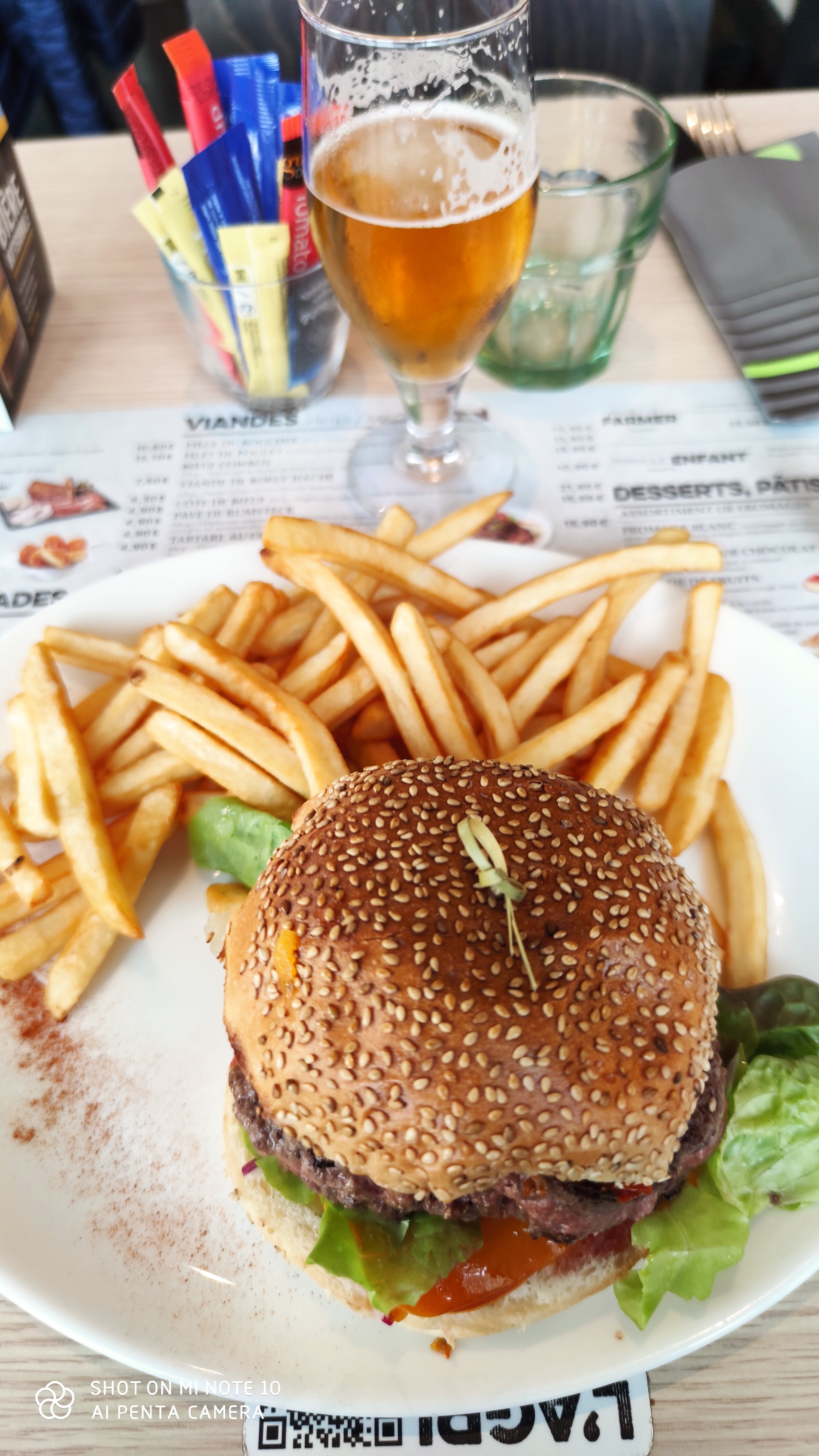 Je n'avais pas le choix du resto en soirée étape et je me suis retrouvé dans cette brasserie. Bof bof c'est vraiment une brasserie bas de gamme et je suis toujours étonné qu'il y ait encore autant de clients qui aiment la mal bouffe pour le prix d'un bon restaurant. Si ça vous plaît pourquoi pas mais on ne m'y reprendra pas. Au fait, je n'ai pas vu les tomates cerises, les petites boules de mozzarella étaient bas de gamme, le cheddar n'était pas fondu, la malheureusement feuille de salade faisait pitié, les frites étaient moins bonnes que chez MacDo c'est dire. Il y a juste la viande qui était correcte.