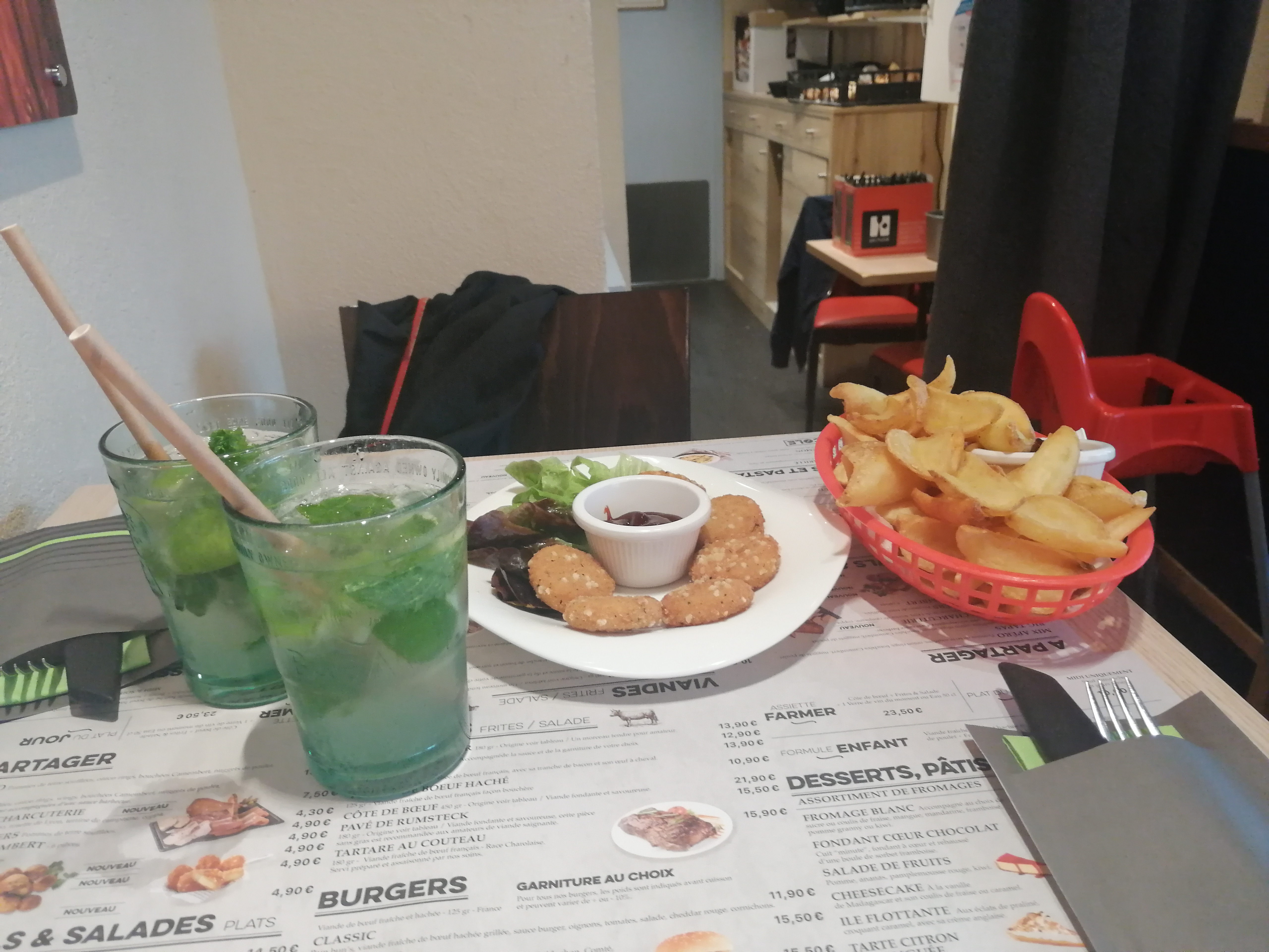 Une super terrasse animée.Un personnel dynamique.J ai commandé un burger italien très bon.Le pain du burger est un véritable régal.La particularité une bouteille d eau gazeuse d un litre de leur propre fabrication payée 99 centimes d euro.La grande classe.A essayer si vous êtes de passage a Nevers.