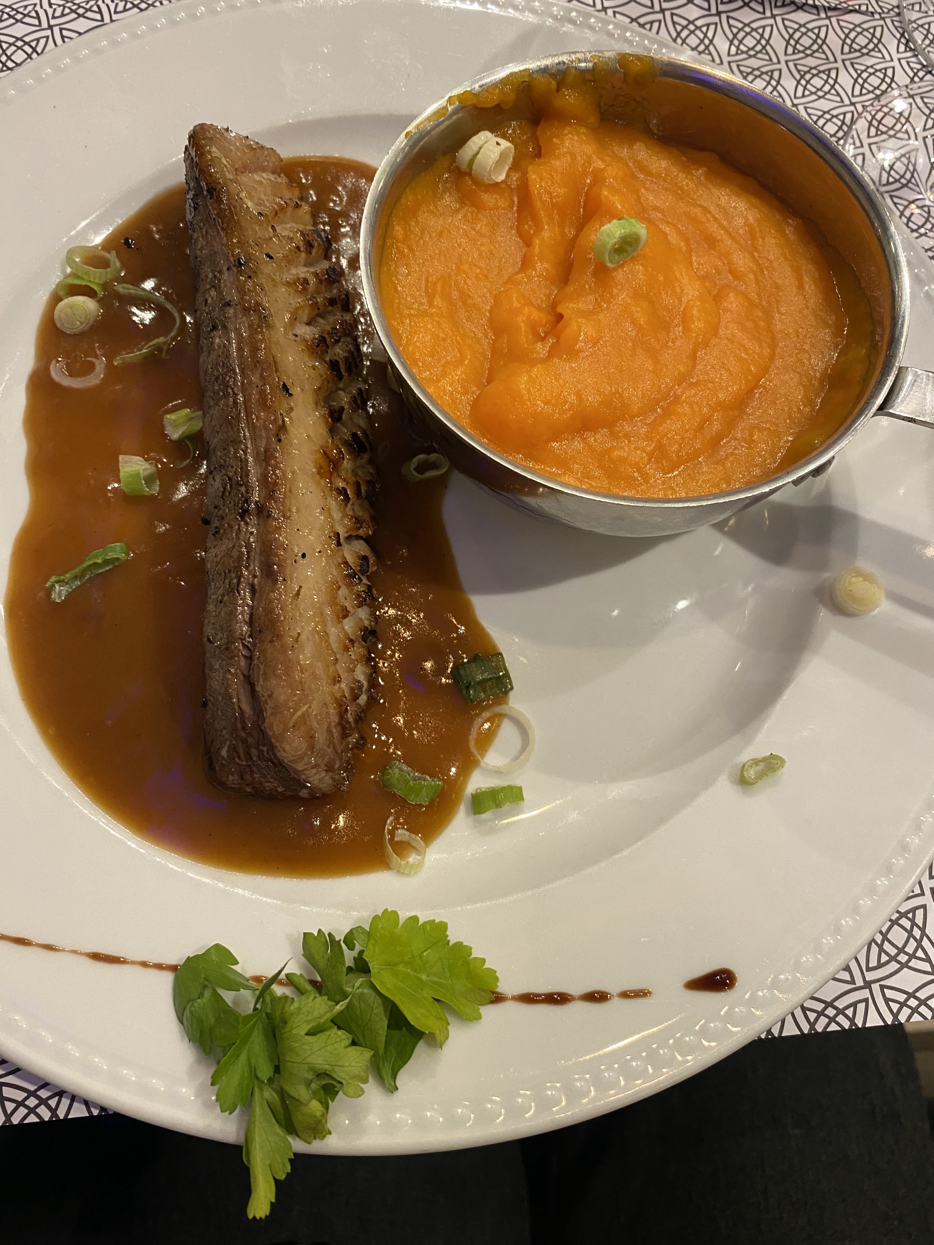 Servi froid, une viande bouillie à l'eau, 1 seul wc pour trop de tables. Ambiance agréable mais le reste ne suit pas. Les cuisinièrs ne portent rien sur les cheveux. Je ne recommande pas.