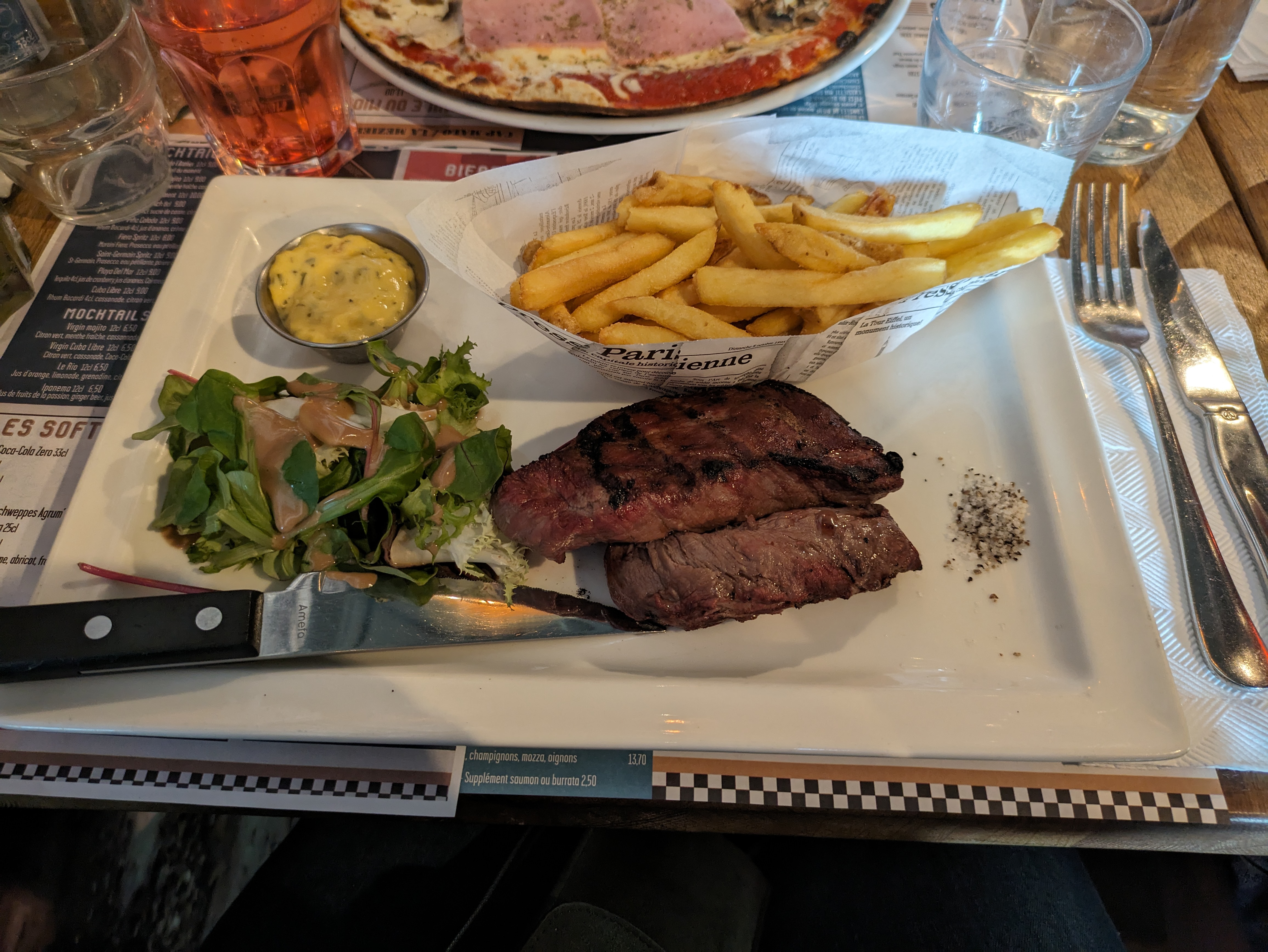 Dommage, les frites ne sont pas maison, mais la viande est bonne et tendre, et la cuisson respectée ! Serveur au top, (Floriant) ainsi que l'ambiance! Merci