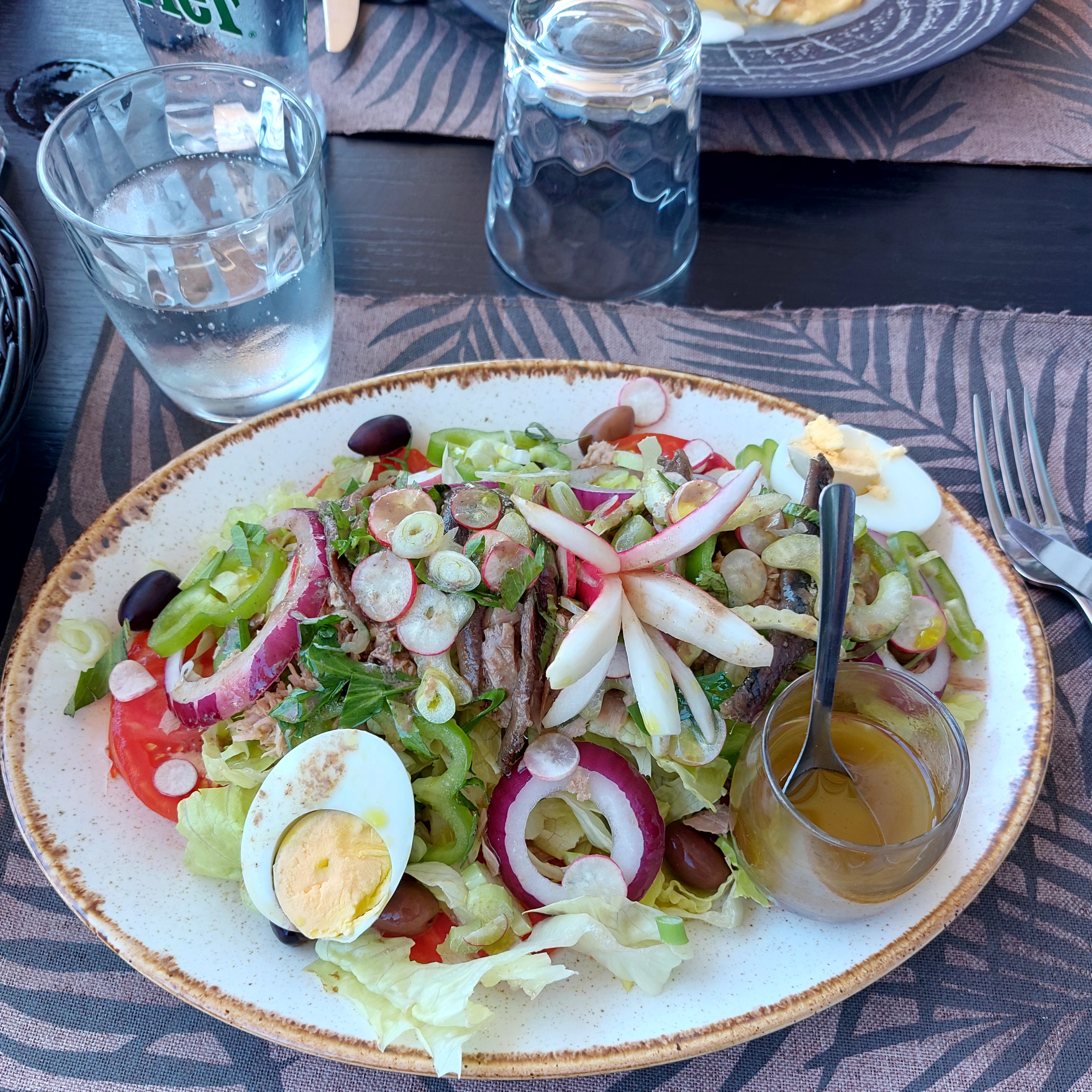 Nous vivons à côté donc nous mangeons ici assez fréquemment depuis qu'ils ont repris le restaurant de l'hôtel. C'est une équipe familiale rafraîchissante, la nourriture est savoureuse et pas trop chère, les boissons sont abordables et le cadre est superbe avec la vue sur la mer. Ces dernières semaines, ils ont organisé des soirées à thème avec de la musique live, ce qui est génial ! Nous les aimons beaucoup et je dois pourtant y manger quelque chose que je n'ai pas aimé. Le menu est un bon mélange de français/italien et pas seulement les « favoris » de la Côte d'Azur. Il y a de la nourriture pour tous les goûts.