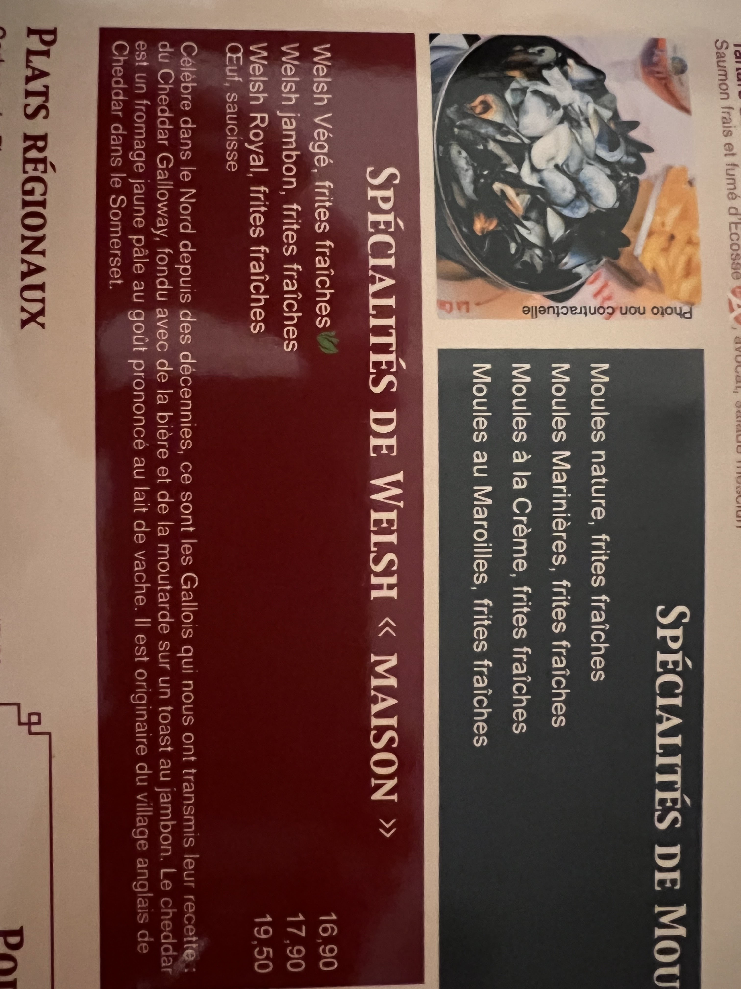 Nous avons découvert ici le célèbre welsh c était délicieux mais le seul bémol que j aurais a redire c'est l accompagnement. Les frites avec un plat déjà très gras j aurais bien aimé une salade ou autre avec. Mais ça reste tout de même très bon mais je n'ai pas pu finir mes assiettes dommage.