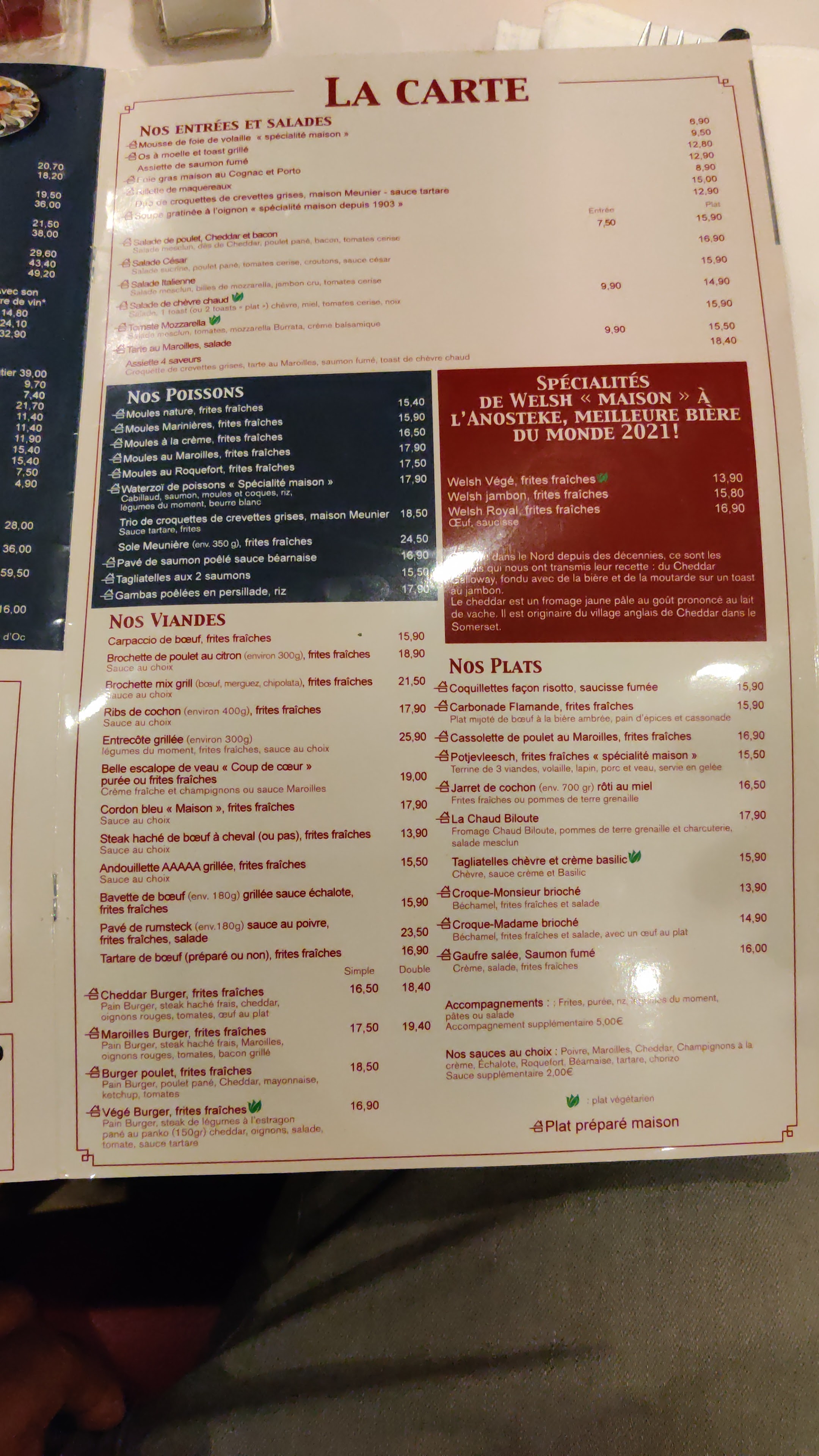 Décevant ! Le filet de poulet maroilles était dur et immangeable, sauce indigeste. Le welsch était tiède et insipide. Service trop rapide. On nous sert le café en même temps que le dessert! Vraiment on ne recommande pas...