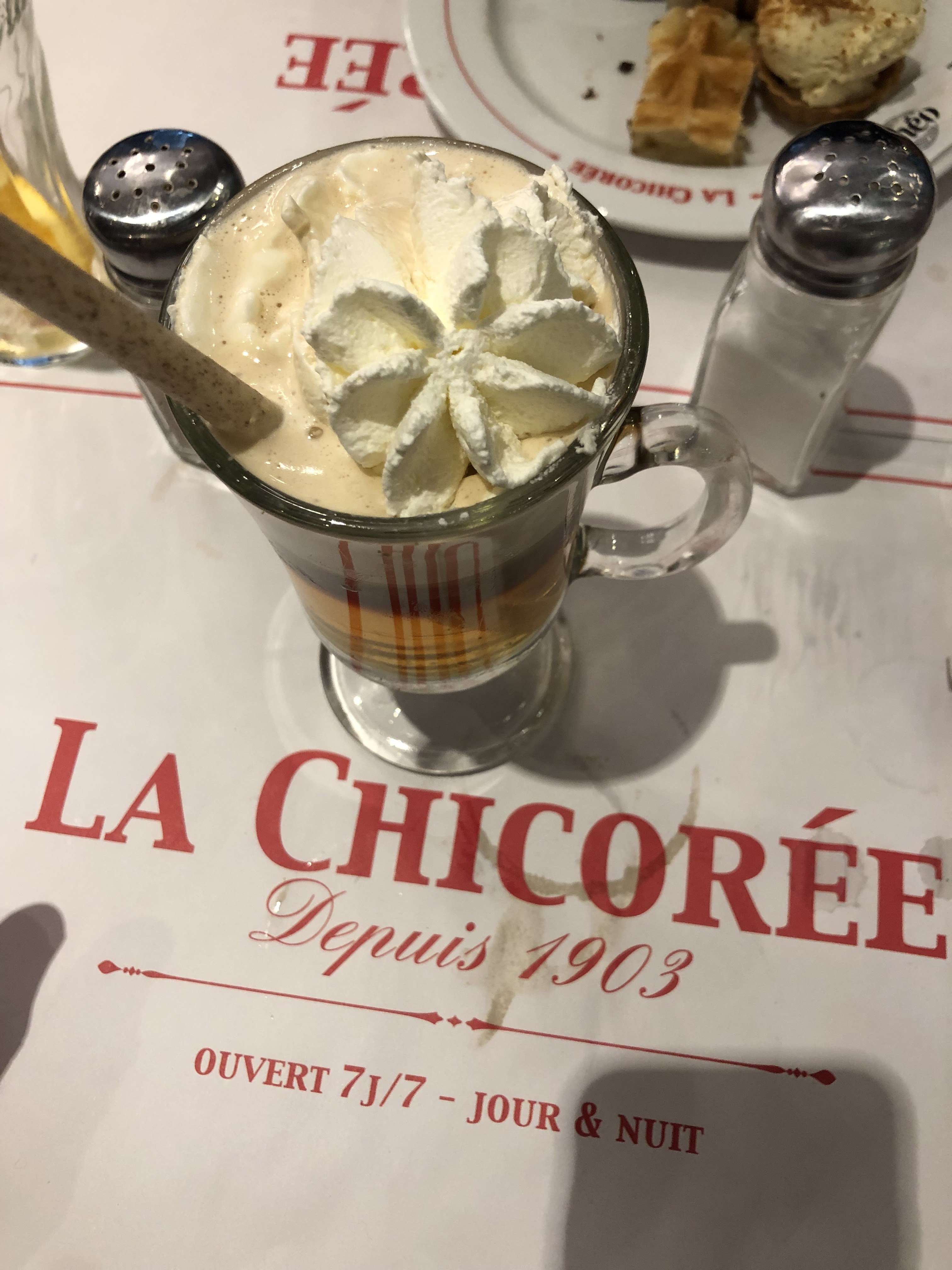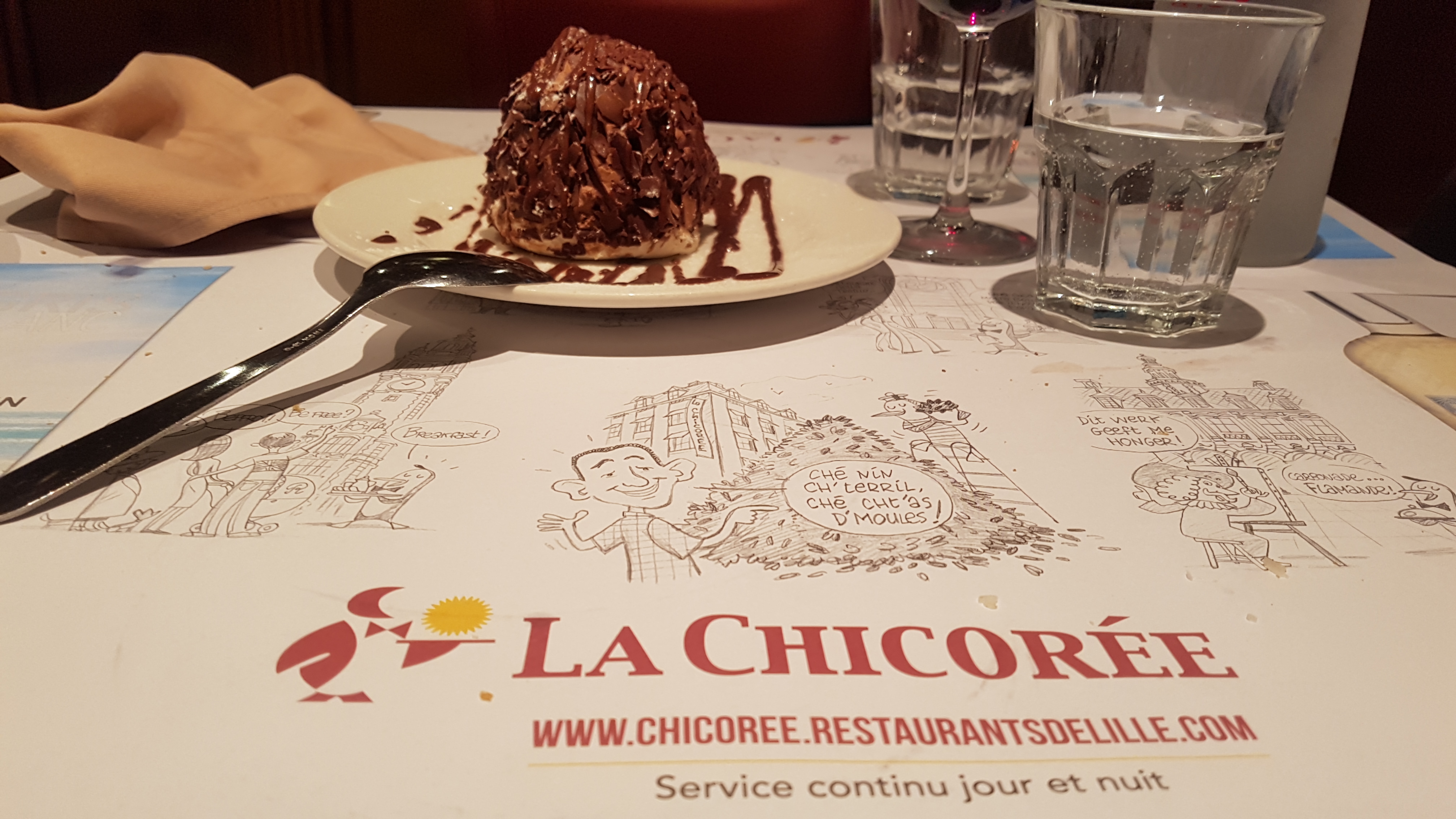 Un dimanche après midi il y’a 15 jours, il faisait très froid. Quoi de mieux qu’une crêpe / gaufre et un chocolat chaud à la brasserie La chicorée. Nous aimons beaucoup cet endroit. Nous y sommes déjà allés pour manger le soir et leurs spécialités locales sont excellentes avec une Grosse préférence pour leurs moules frites.
