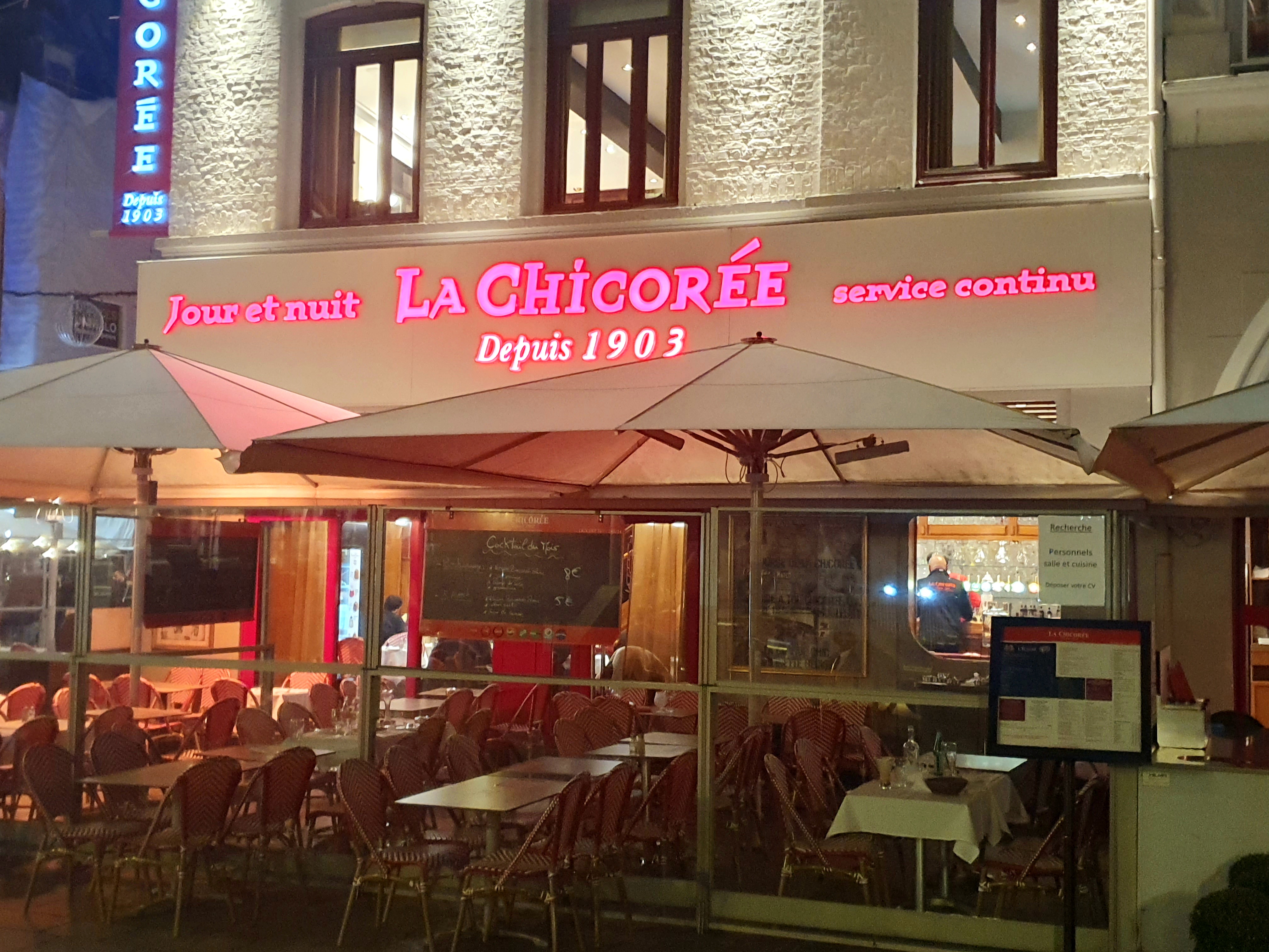 BRASSERIE LA CHICORÉE est un institution culinaire dans le centre-ville de LILLE depuis des décennies : 1grand établissement de coin sur plusieurs niveaux, équipé d'1 très grande terrasse couverte; accueil et service à la française par un personnel sympathique et professionnel; belle carte de mets et boissons variées.....y compris 1 bel étal de fruits de mer, crustacés, etc.....