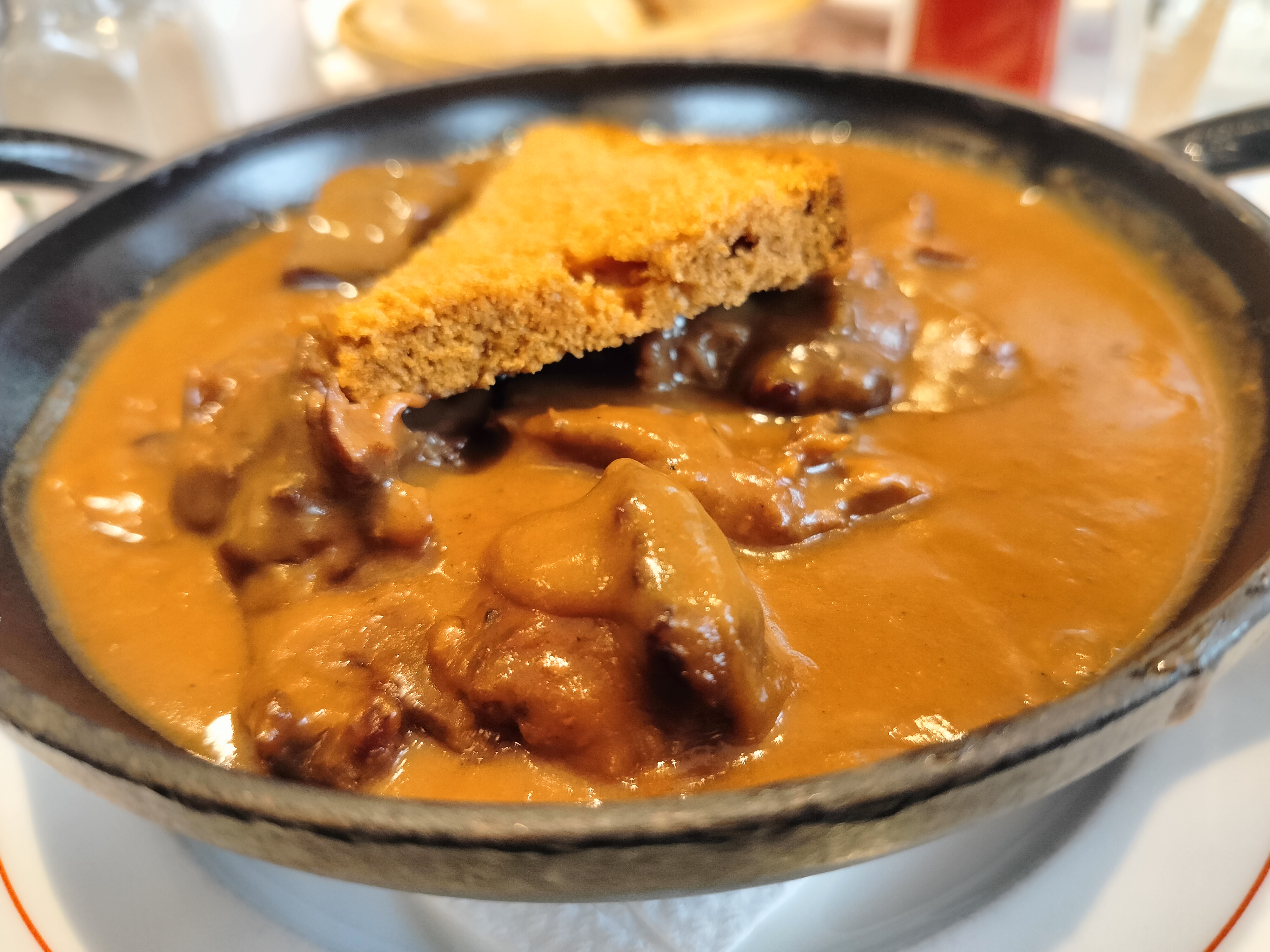 Boffff, une première fois de passage mais déçu ! Prendre un escalope de veau sauce champignons et reçevoir ce plat dans une mini assiette sans une déco, sans une feuille de salade, il fallait chercher les champignons🤔🤔🤔... Pas top et très cher 19€ !!!! ...
