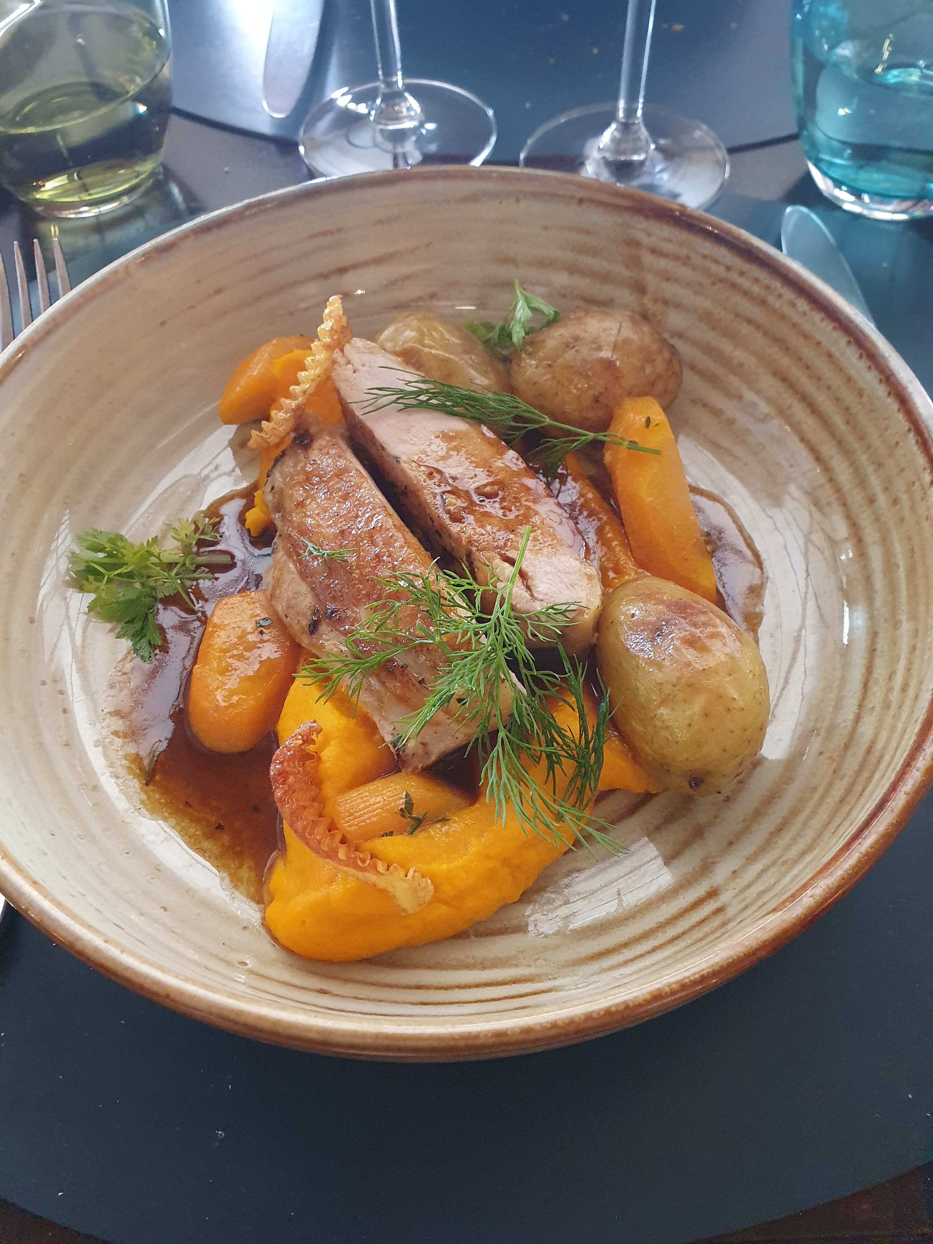 Bon accueil... Beau cadre.. Personnels très agréables... Pour moi un peu rapide en service !!! Peut-être demander si l on est pressé ou si on a le temps car pas le temps de respirer entre chaque plat !! Comme si urgence.... Nous nous avions le temps et malheureusement à peine le temps de finir que l autre plat arrivait... Sinon très bon et de qualité pour le prix de l ardoise du jour... Par contre le vin au verre et le café trop cher. Le café(5€) est servit ce ci dit avec un financier et une clémantine après un dessert c est de trop ..donc peut être pour ceux qui ne prennent pas de dessert ?? A ajuster suivant es desirs et envis de chacun. Ces commentaires ne sont que pour améliorer ou adapter celon les envis des clients puisque ce lieu donne à penser qu on fait le maximum pour nous satisfaire. Bonne Année et Merci 🙏