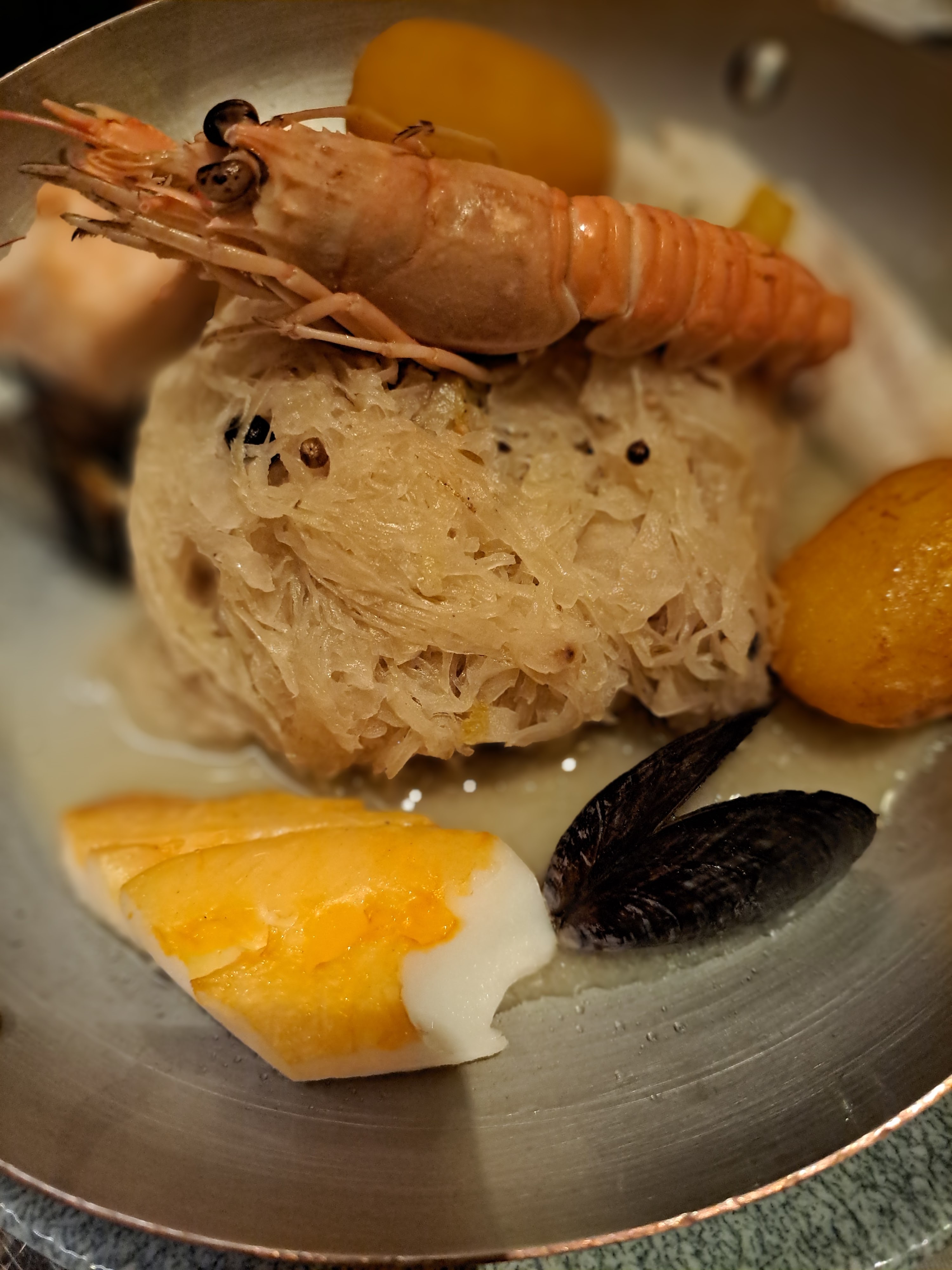 Mitigé déjà il faisait... froid ! Tempête non stop dehors... On nous changé de table mais c'était pas mieux, normal on a appris ensuite que le chauffage n'était pas allumé. Grosse déception: la raviole de langoustines dans son bouillon, gingembre, champignons. On imaginait un plat un peu asiatique... que nenni ! PAS de bouillon. pas de gingembre, pas de champignons. Mais une purée de légumes ou baignait la raviole. 19.50€. J'aurais dû demander à ne pas la payer. Du grand n'importe quoi. Filet de bœuf Chateaubriand et béarnaise: bien frites: correctes moules: correctes sans plus couteaux et oursins: bien Vin blanc de Touraine: bien café gourmand: bien mignardises: royales ;)