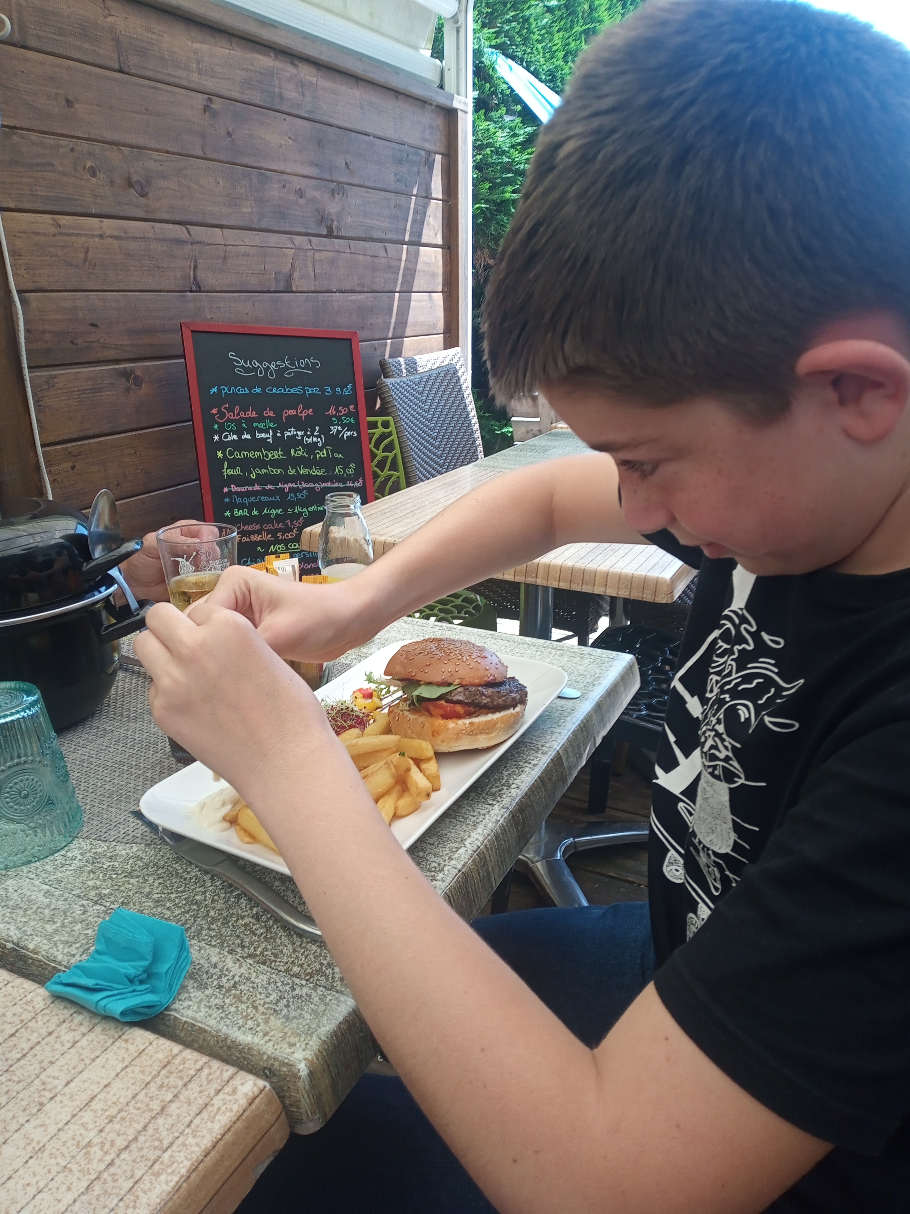 Repas d'anniversaire au cours des vacances. Très apprécié par toute la famille. Parents et enfants. Nous avons mangé en terrasse dans un décor cosy très agréable et propice à la détente. Le service est agréable, nous sommes accueillis avec le sourire tout au long du repas. Nous avons testé des moules au roquefort très parfumées, une brochette de gambas au piment d'espellette (plat du jour) agréablement relevée ainsi que la sauce aux herbes fraiches qui l'accompagne. Le burger a énormément plu aux enfants. Pour le dessert nous avons testé le pire gâteau au chocolat ! Un régal effectivement on est les pires gourmands 😉 Nous avons aussi testé les boules de glace bien parfumées et appréciables en cette saison. Adresse que nous recommandons sans hésiter. C'est la pépite d'or !