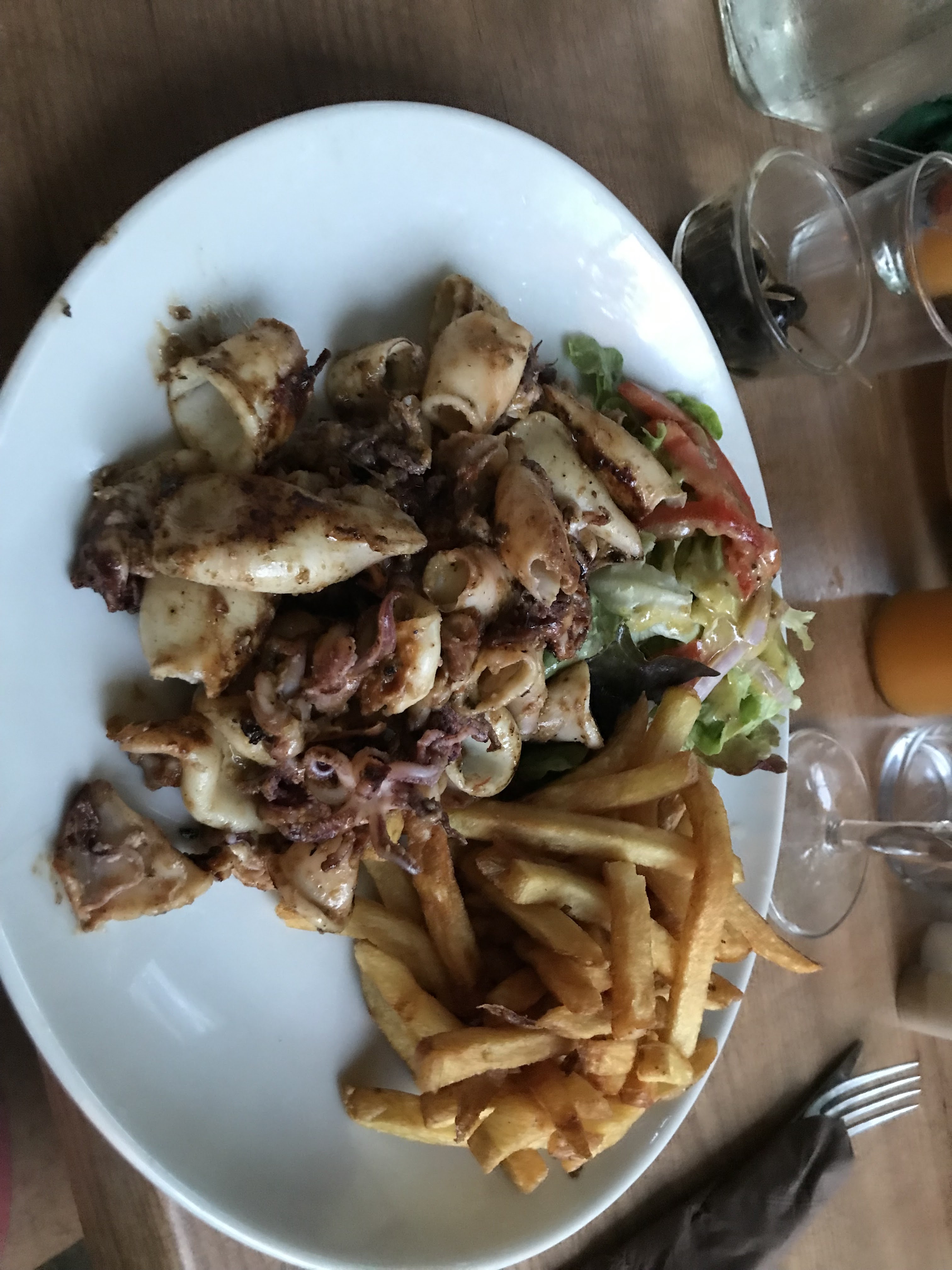 Paella excellente,copieuse avec de grosses crevettes et langoustines,calamars, chorizo... cuissons parfaites.Bref un bon moment tout simplement,je recommande.sercice correct malgré une forte influence.Merci La Regate
