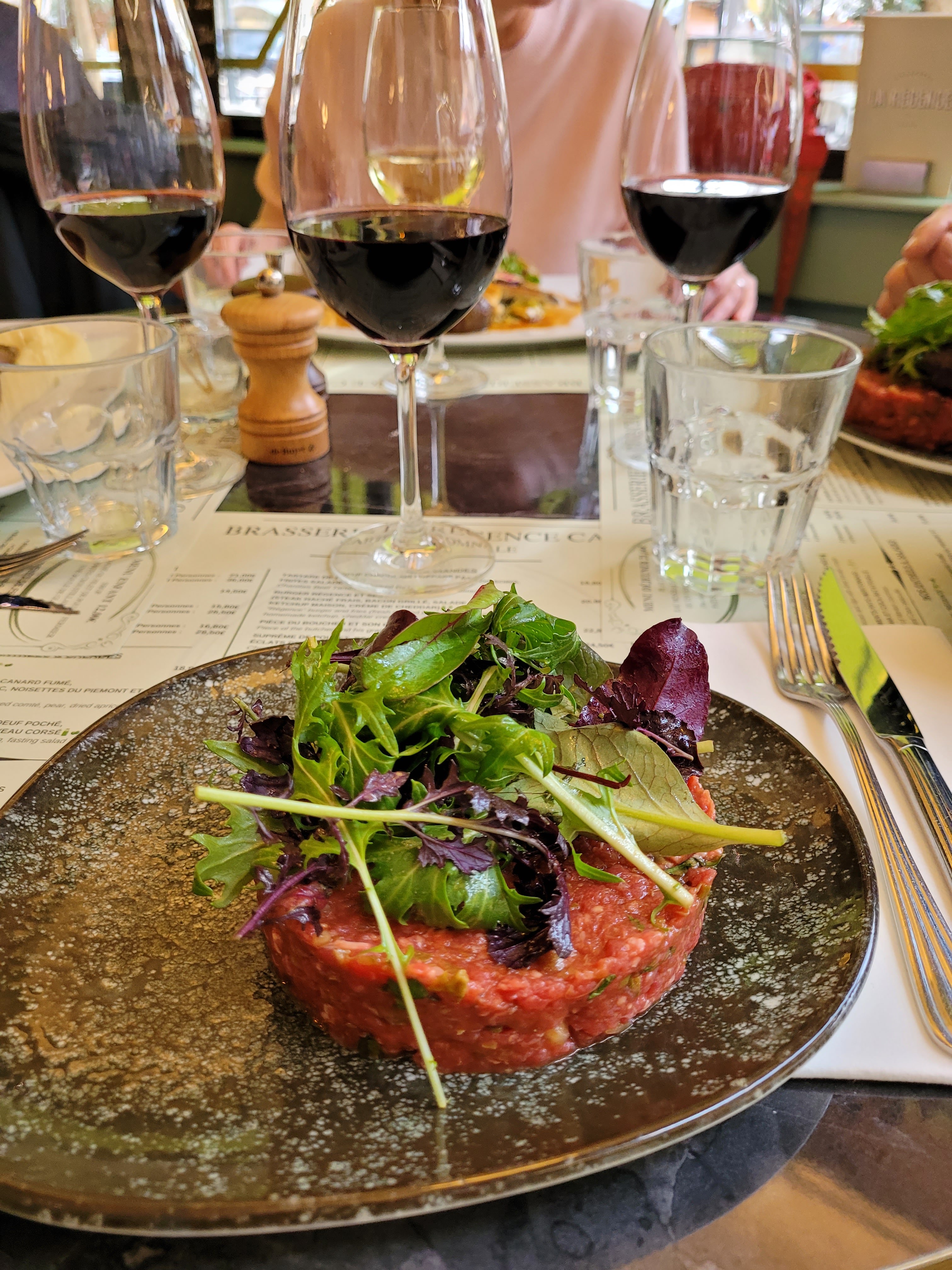 Cuisine de brasserie solide dans un cadre extérieur très agréable. Le vin ((Moulin-a-vent) était particulièrement agréable et accompagnait bien le faux-filet et le tartare de bouef