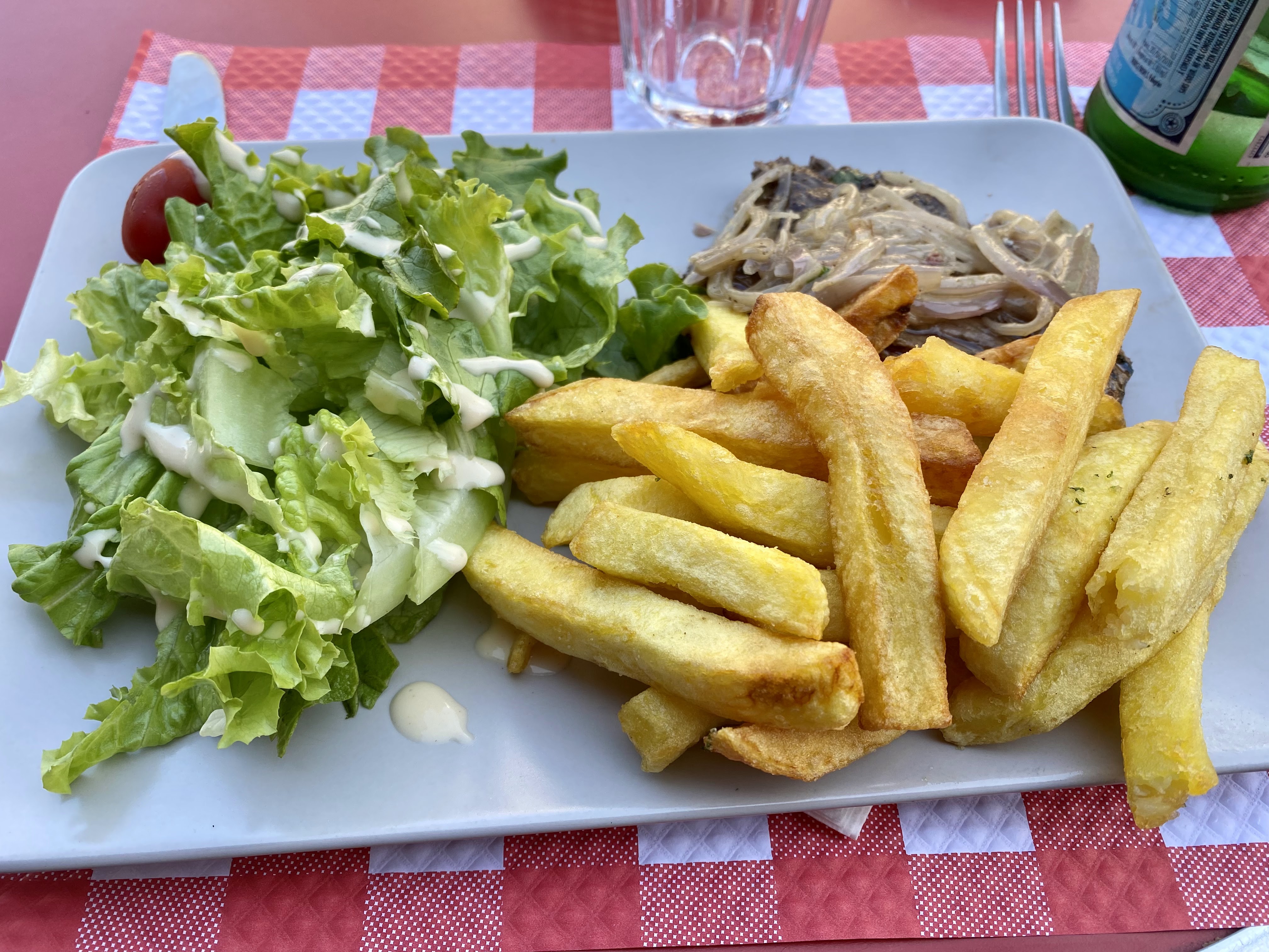 La nourriture était bonne et le personnel accueillant. Il y eut rapidement de la nourriture sur la table. Nous avions un menu hamburger avec des frites maison.