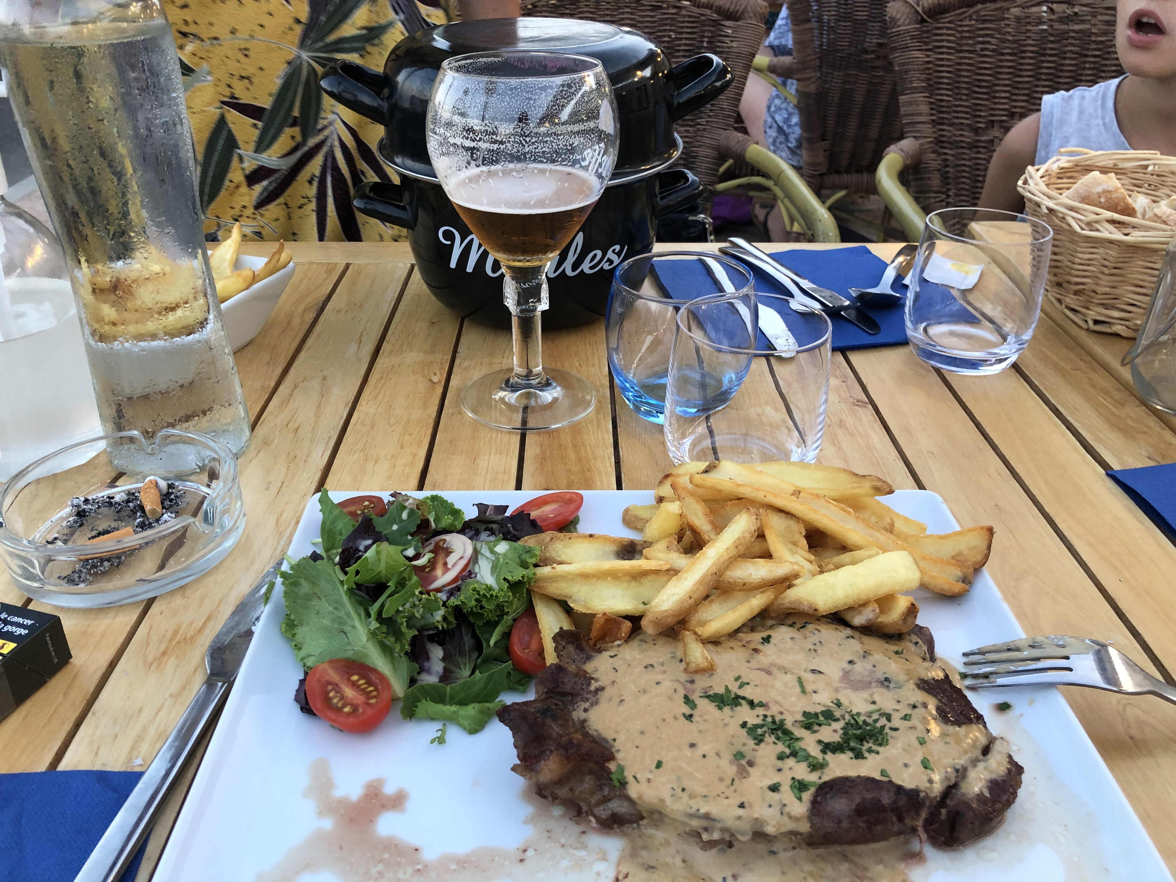 Frites surgelées, moules sèches, petites et trop salées, sans parler des nombreuses guêpes qui rôdent autour de votre assiette. Passez votre route.
