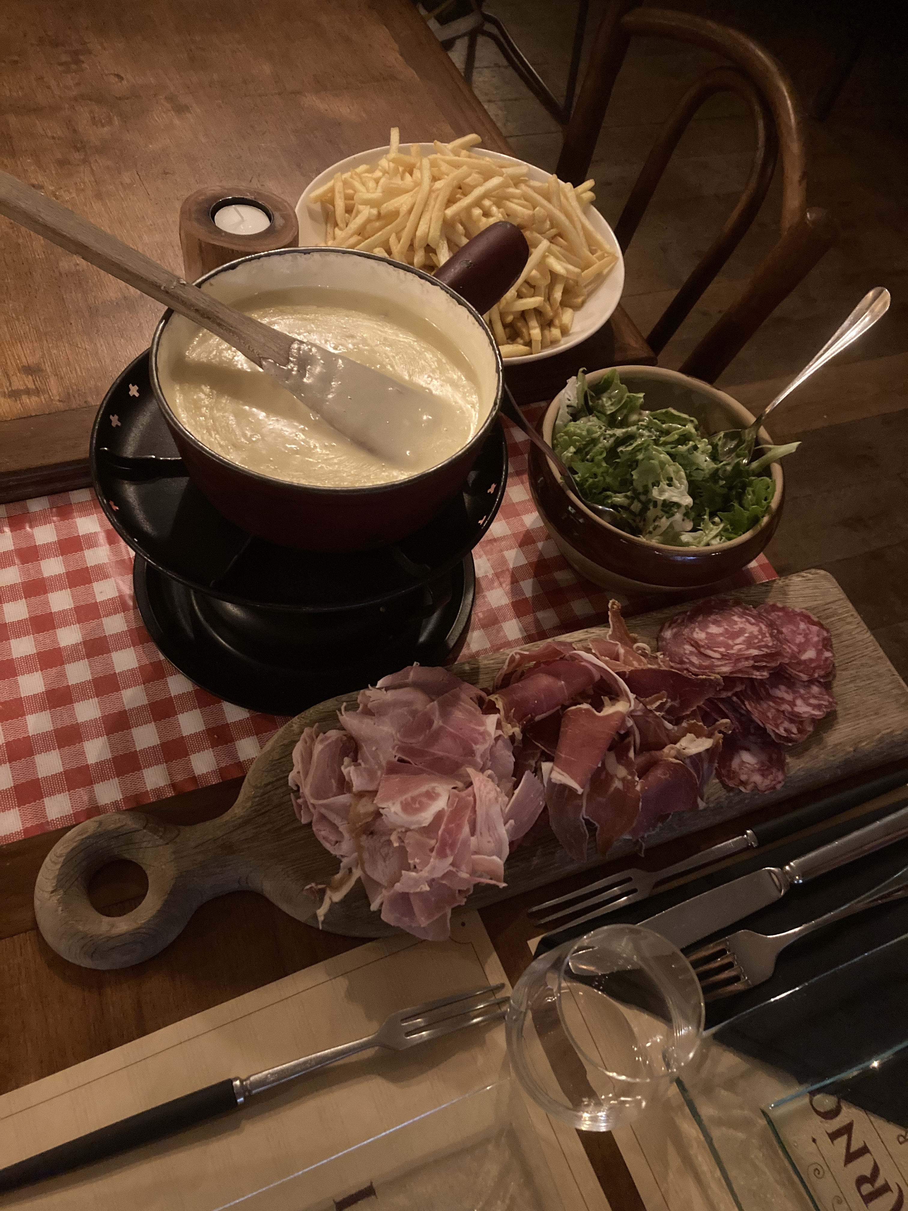 Un service désagréable . Très froid. Une fondue avec beaucoup de fécule qui est très pâteuse . Il est difficile de donner une bonne appréciation. A améliorer.