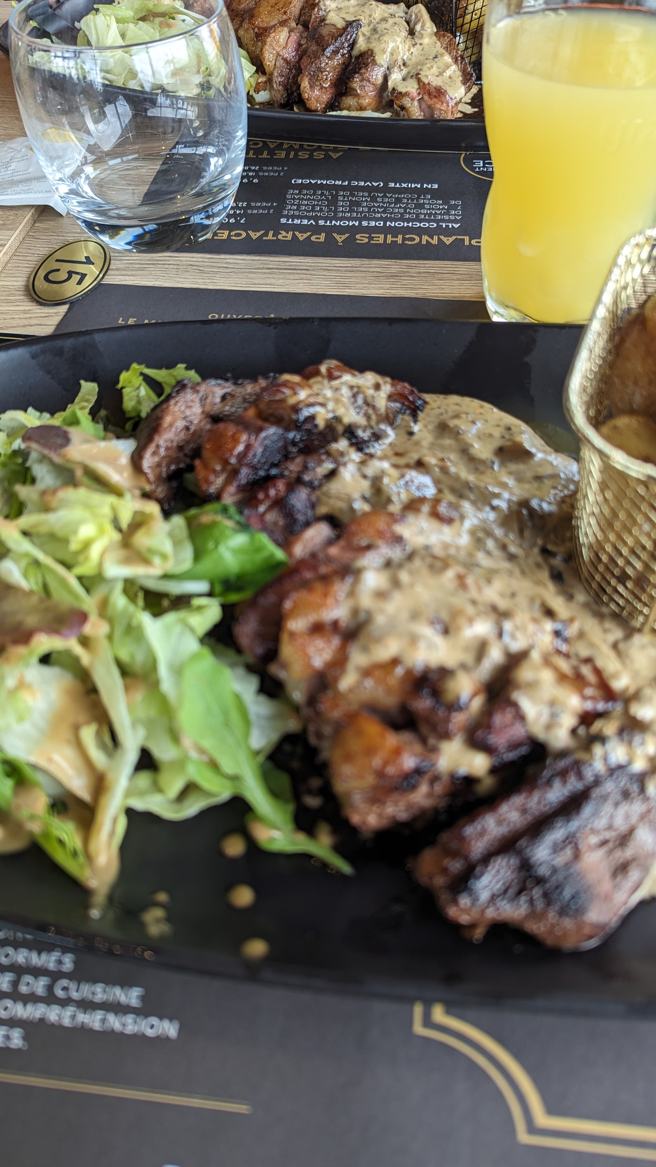 Pain coupé à l'avance donc dure. Pareil pour la charcuterie. Entrecôte presque immangeable, beaucoup de gras et de nerfs. Ribs de bœuf en trop trop grosse quantité et beaucoup de gras autour. Les deux plats baignés dans l'huile. La sauce au bleu était elle aussi rempli d'huile. Nous n'avons même pas pris de dessert. Un rapport qualité prix MAUVAIS !