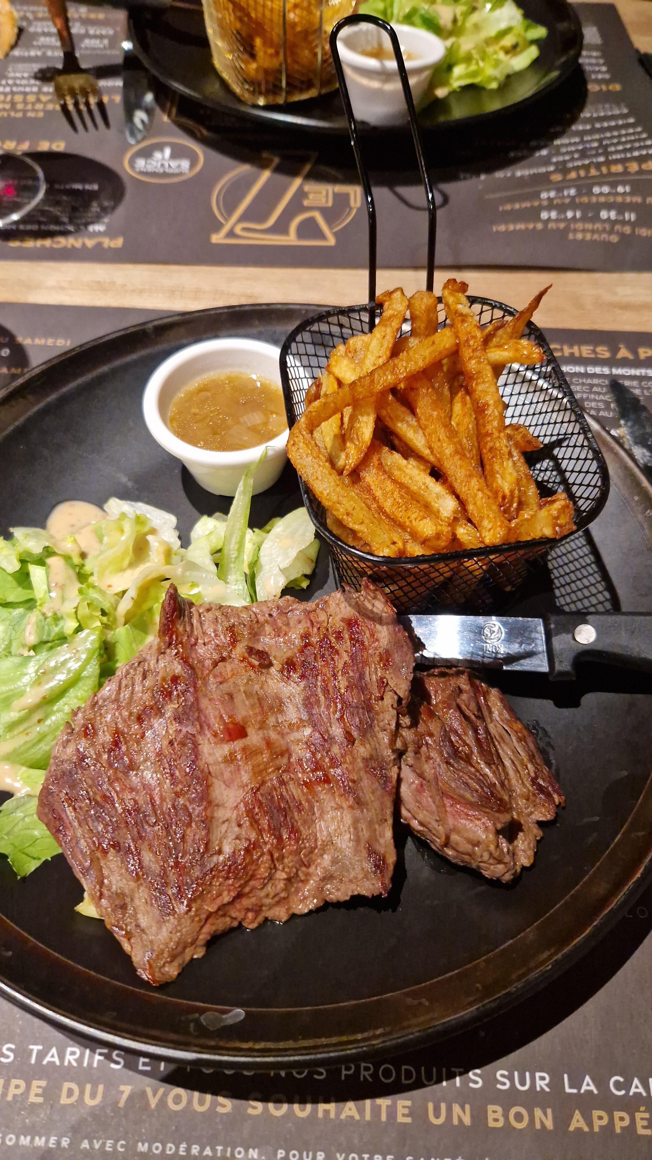 Très belle soirée ! Un restaurant propre, très belle vue dans la salle intérieur La musique n'est pas trop forte, la terrasse bien ombragé Le serveur, c'est une pépite ! Soucis du détails et de l'avis du client. Pas besoin de demander une autre carafe lorsqu'elle est vide, de lui même il le fait. Très agréable, souriant et d'une politesse !! Il est pleins d'initiatives et d'attentions En cuisine rien à dire ! La cuisson des viandes est respecté, les plats arrivent chaud, les boissons sont fraîches. La viande à du goût et est très bonne. Les plats sont généreux et joliment décorés ! Un restaurant que je recommande. Nous reviendrons ! Encore merci à toute l'équipe !