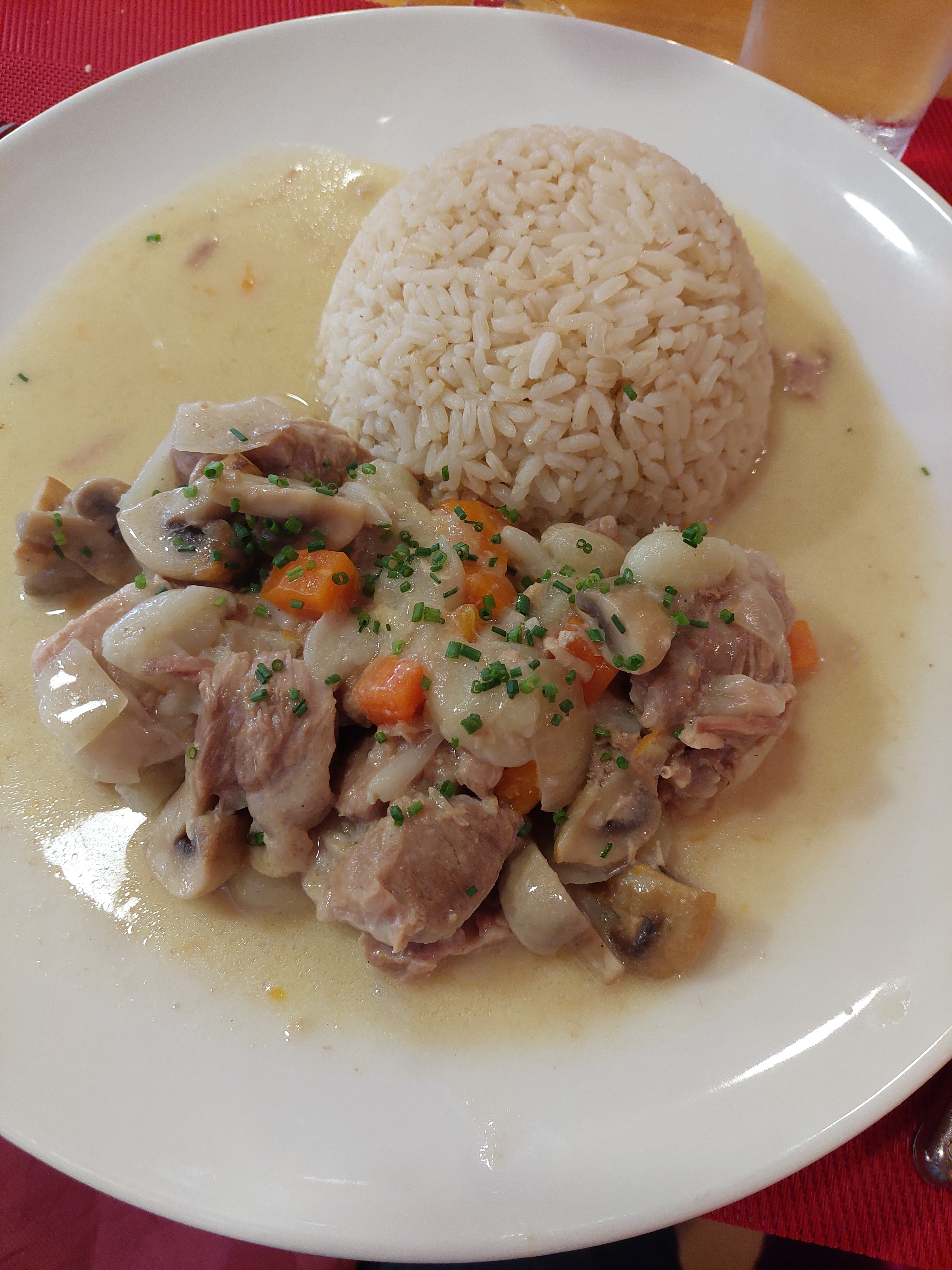 Menu du jour 19 €, 3 plats. Excellent. Chien amical.