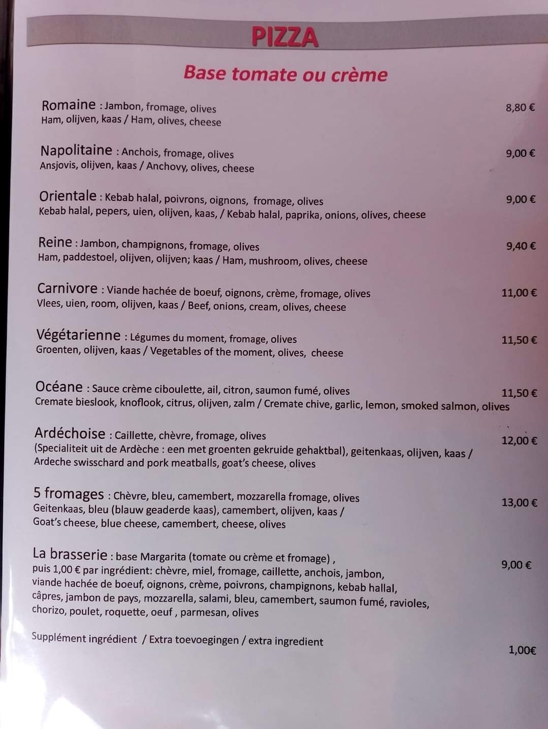 Déçu Le service très agréable. Par contre nous avons était déçu par la cuisine. Les ingrédients de la pizza pas du tout cuisiné, ça sent le passage du congélateur au dessus de la pizza directement. Pour la viande haché , les oignons , les poivrons…. Si bien que nous avons mangé que la moitié , on as demander d emporter l’autre moitié. Oubli de la serveuse : elle est passé à la poubelle. C’est pas très grave. On nous as proposer un café en dédommagement..Non merci. Peut être c’était pas le bon jour..