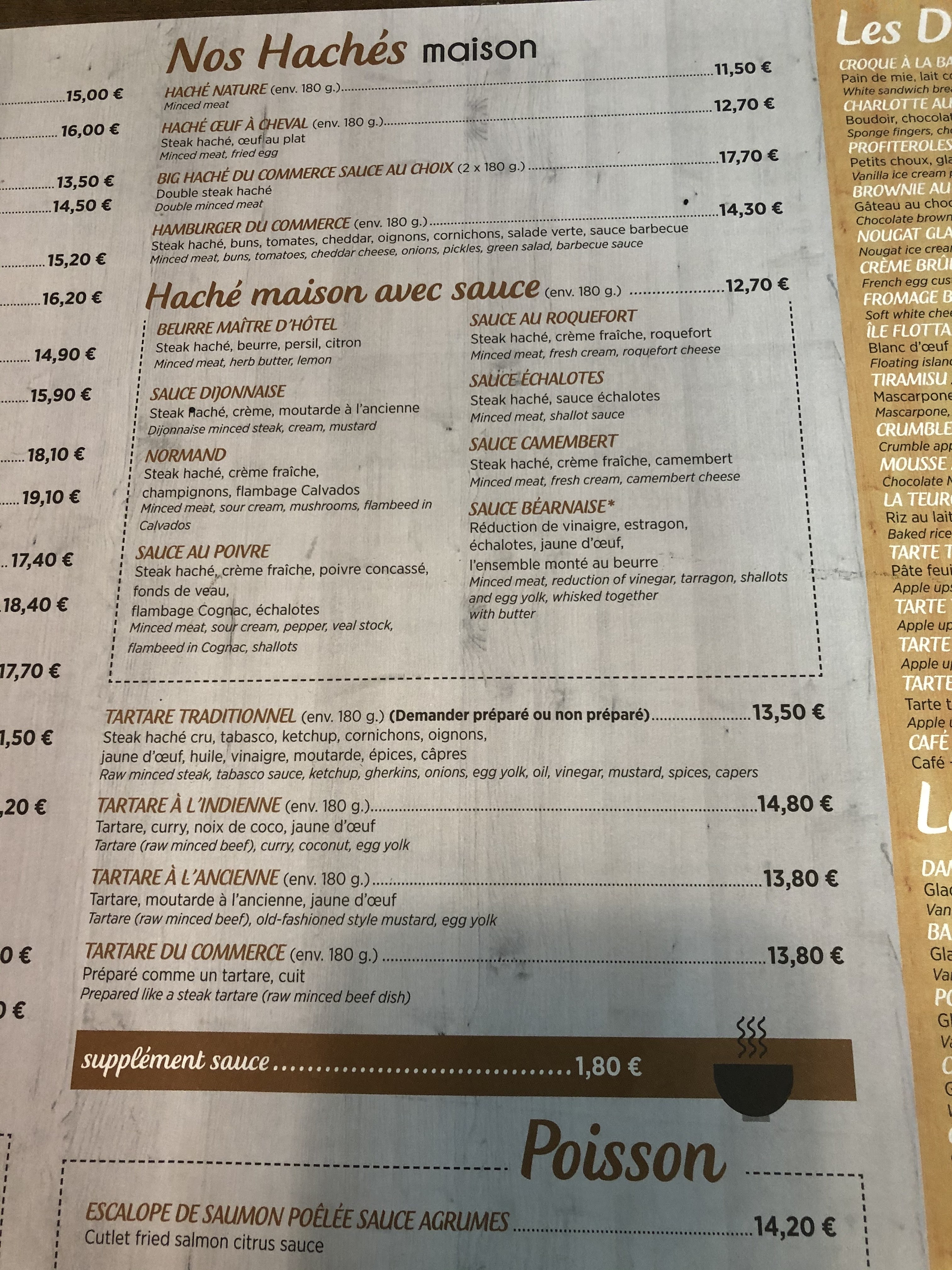 Nous avons pris le Menu DUO (plat + dessert) à 14€ le menu = 2 steaks hachés maison, 1 charlotte et 1 tarte normande, bon repas, rapide. Les MOINS = nous étions sur une table face aux toilettes avec porte « saloon » voir les allers/venus ce n’est pas top top et observer ainsi le serveur aller aux toilettes avec son tablier .. bof niveau hygiène..à remédier ..