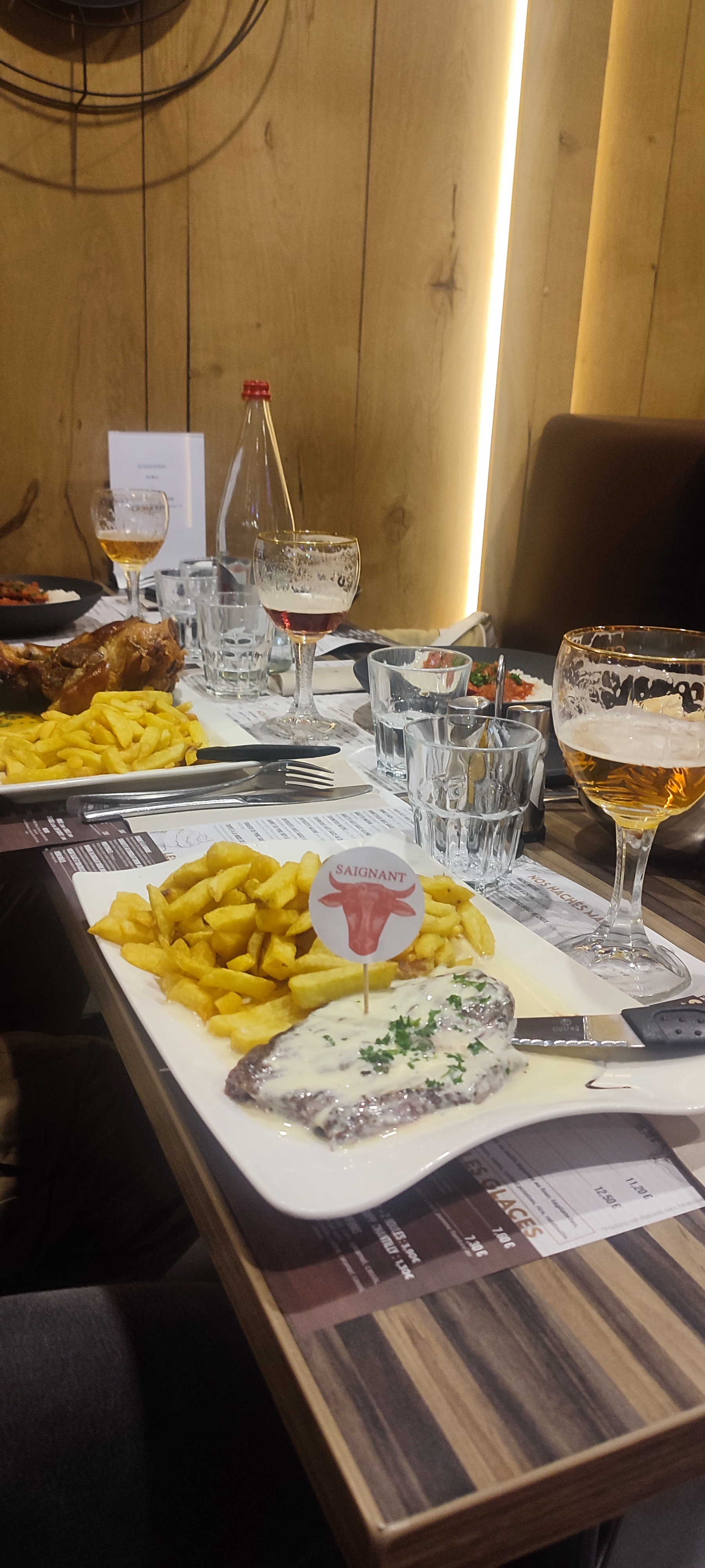 Repas entre amis plutôt réussi. Très bon service. Les serveurs étaient aimables et très pro. Bien décoré et propre, le restaurant est accueillant et donne envie d'y revenir. Côté ambiance, c'est plutôt sympa. Autour de notre grande table, il y avaient plusieurs anniversaires avec gâteau, bougies et tout le folklore qui va avec. D'ailleurs, à éviter si vous chercher un dîner romantique et calme car c'est vivant et assez bruyant. Un petit bémol côté cuisine. J'ai commandé une pièce du boucher et j'ai eu une espèce de petite boule de viande. Bien cuisinée finalement mais ça surprend au niveau de la forme. La sauce roquefort était très bonne. Pour finir, le personnel en caisse devrait être un peu plus aimable. Très bon moment passé dans ce lieu au final. J'y retournerai certainement.