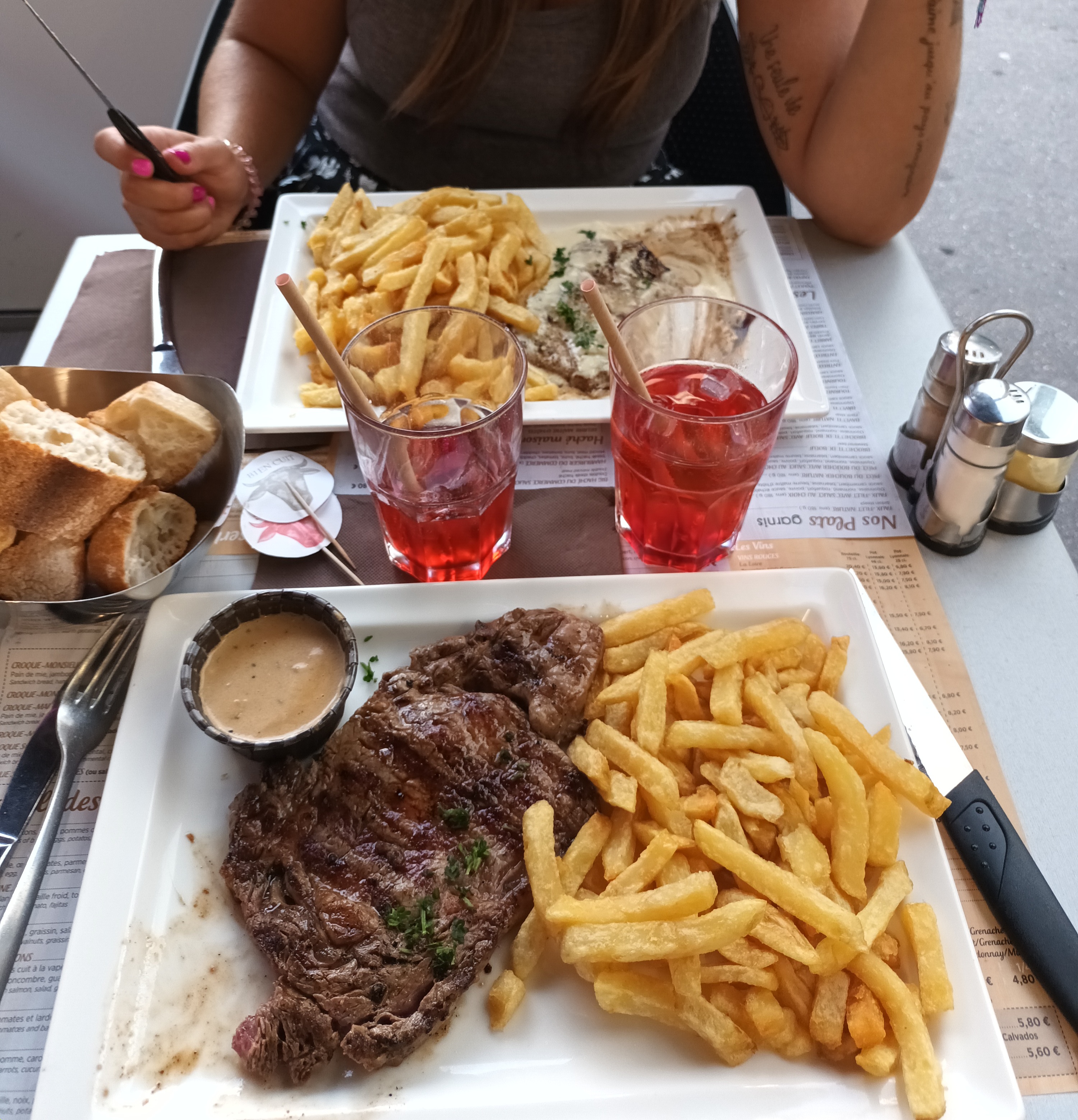 Bel endroit pour déjeuner. 4 boissons 2 plats et 2 entrées 42 €. Le steak hache était bon mais rare signifie rare en France alors soyez conscient. Service très rapide avec un personnel parlant anglais