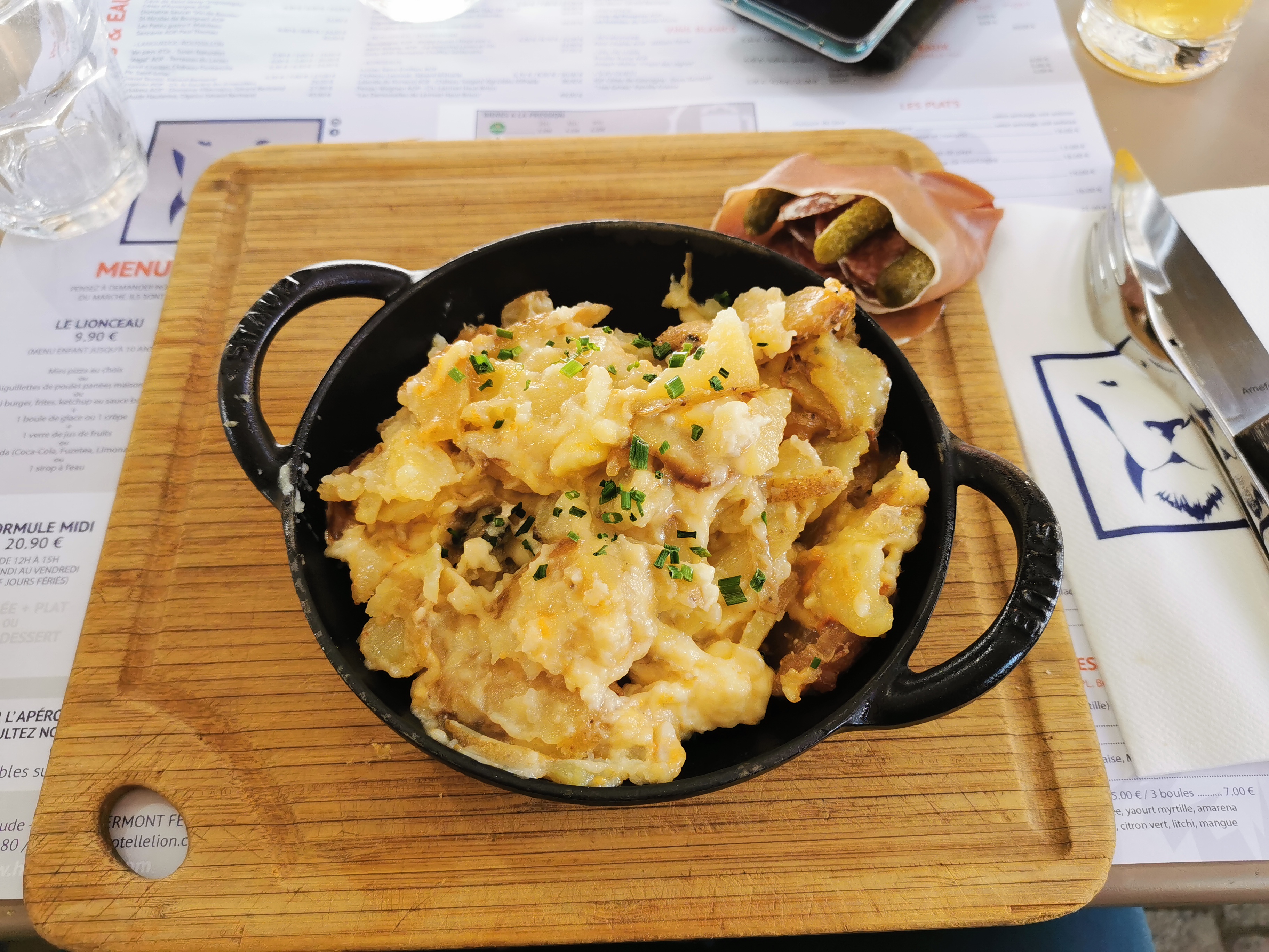 Truffade maison à la tomme.... Plat à 18€ destiné pour un enfant de -12 ans.. Ils ont oublié la tomme, il faut la chercher dans le plat.. Et jambon de pays C est bien 1 tranche de jambon avec 3 cornichons et 6 petites tranches de saucissons😂 Je repars sur ma faim...