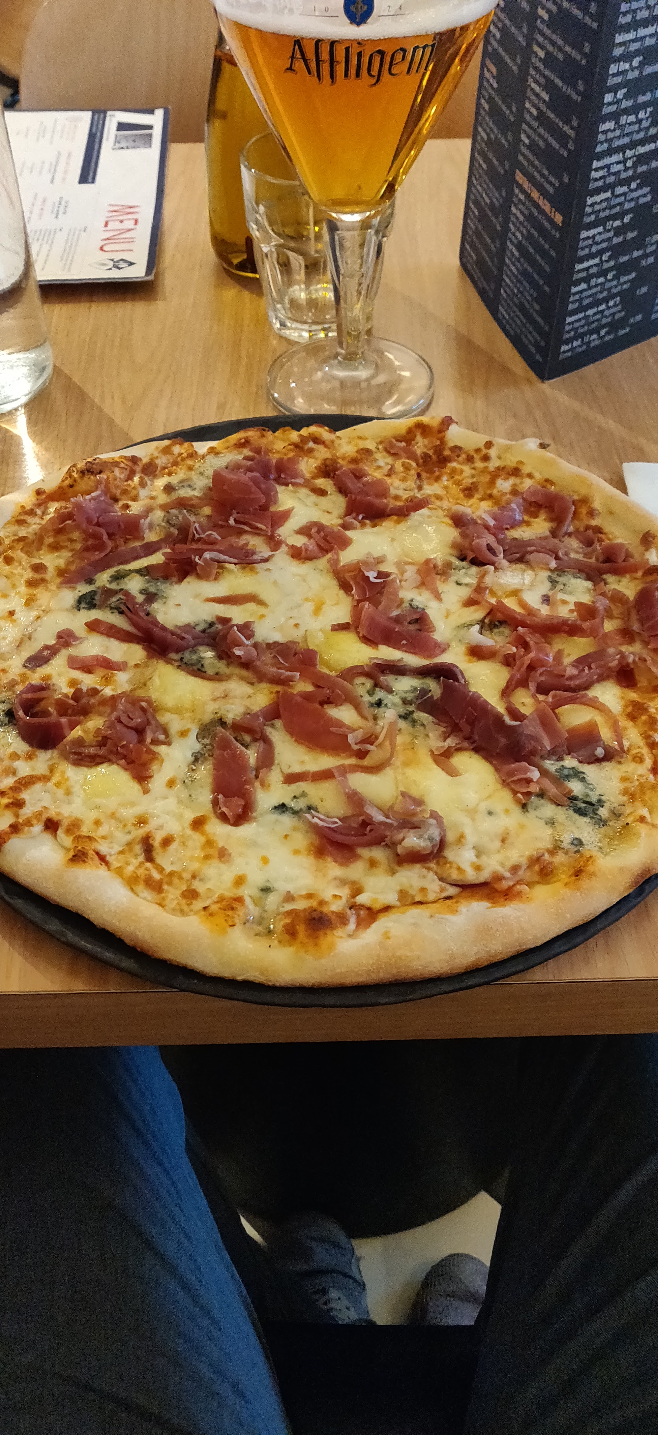 Très bon accueil , très bon service,bonnes pizzas bien garnies , pâte épaisse , hamburger , très bon, steak haché bien épais et bonne cuisson,pour le cadre, une belle vue sur la grande place .