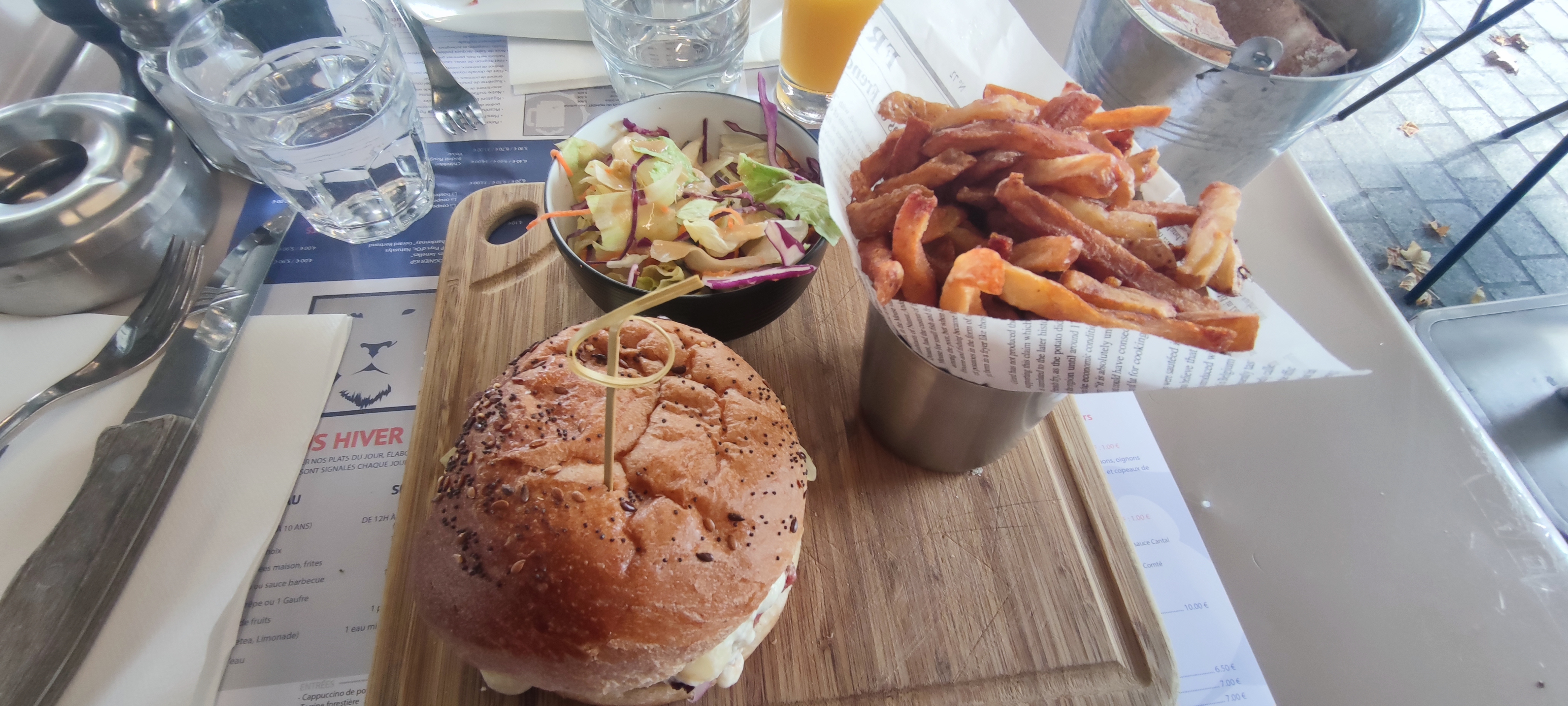 Accueil; protocole sanitaire très bien. Pour le repas : formule sur le pouce et bien c'était très bon très copieux. Pour l'hamburger très bon très copieux. Des serveurs très gentils avenant et malgré le masque souriant ! Je recommande