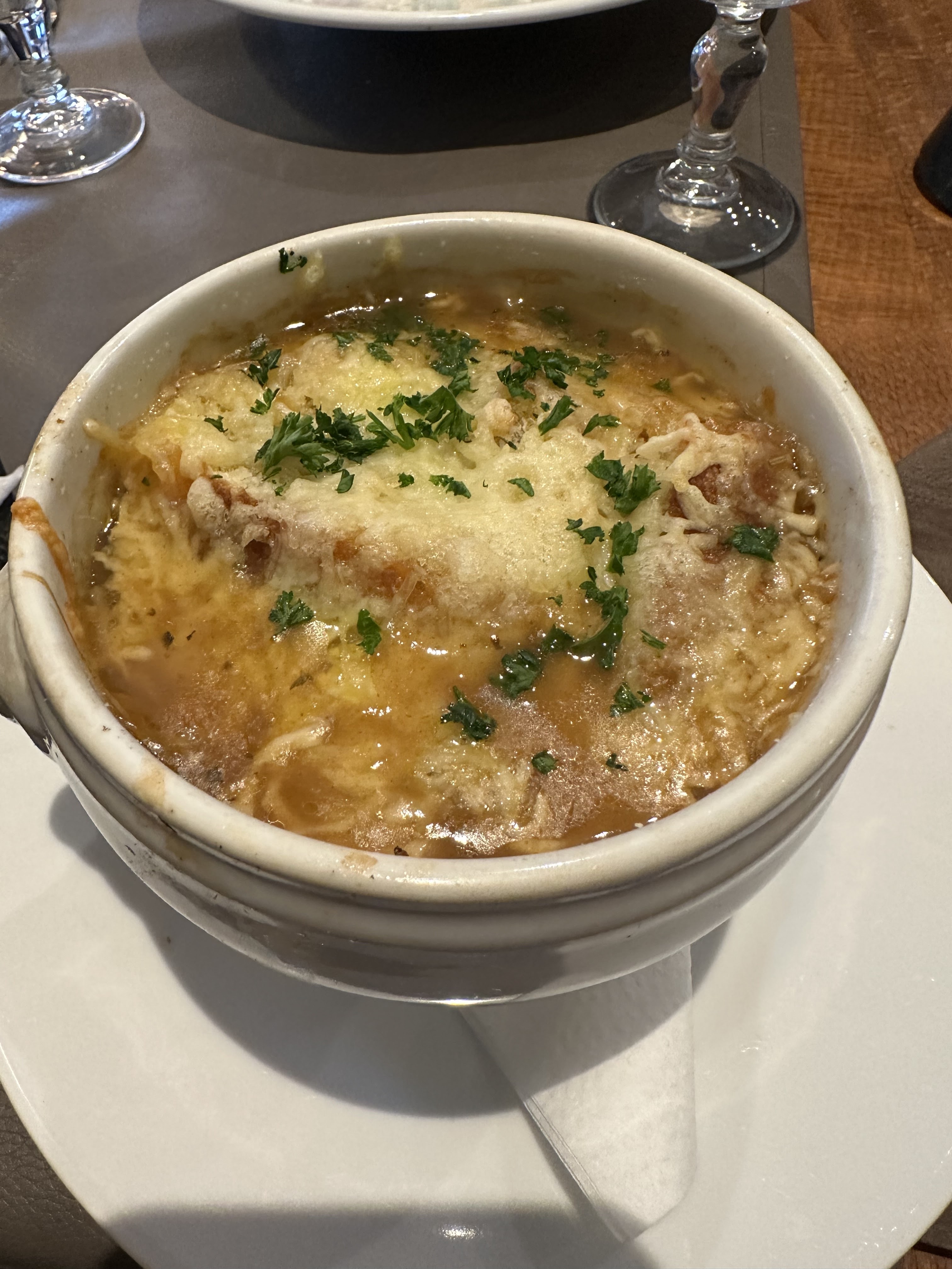 La soupe à l'oignon était délicieuse ! Le personnel était vraiment sympathique et serviable. Je recommande vraiment cet endroit.