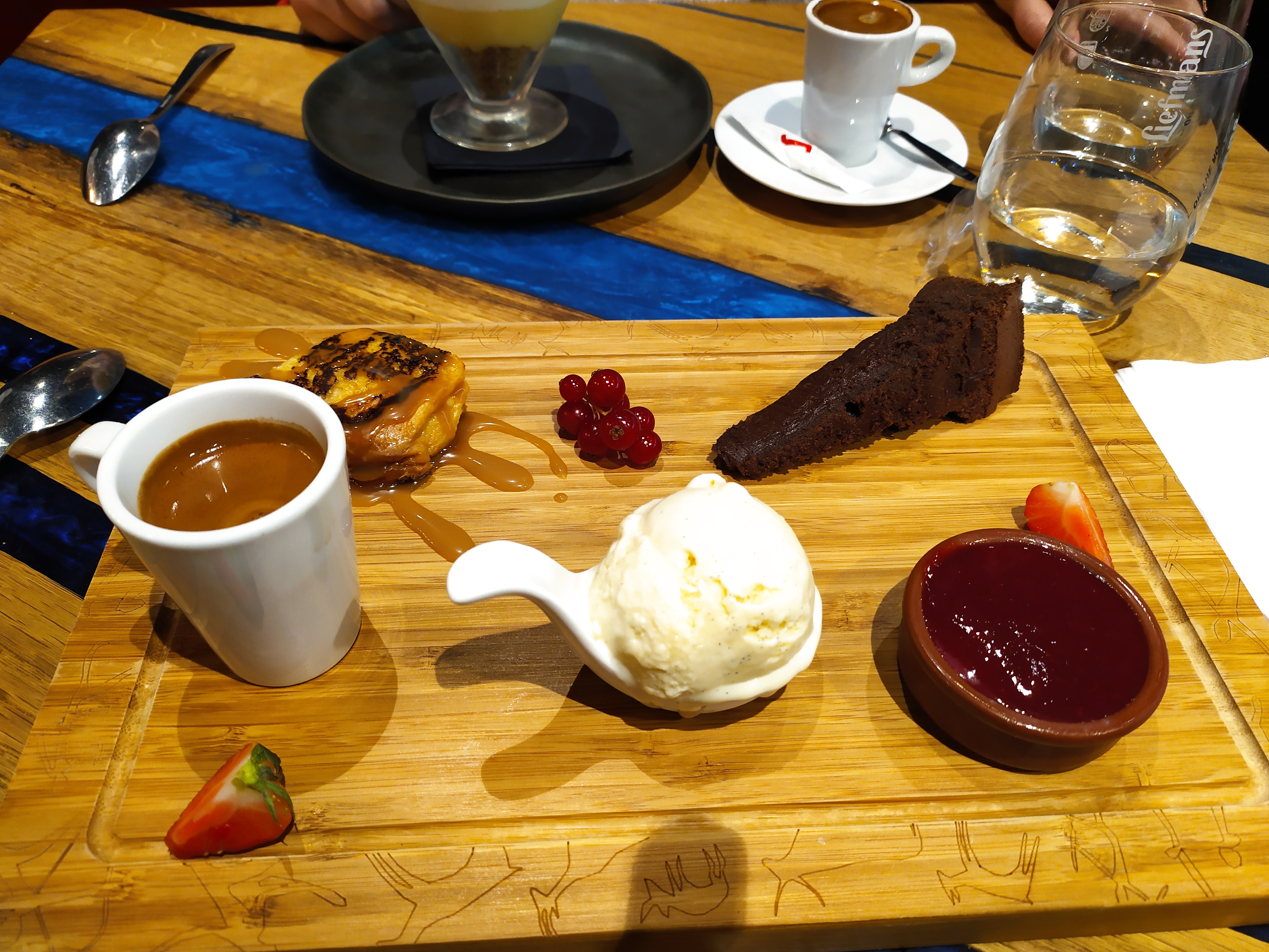 Pour le repas nous avions pris : un cabillaud ,qui était le plat du jour, et un plat de linguines végétarienne ,rien d'exceptionnel, mais bon.Par contre pour le dessert j'avais un café gourmand 3 chocolats à 7€,pour avoir 3 chocolats de Noël et un expresso,franchement abusé, rien de gourmand dans ce café gourmand ! Et visiblement le patron n'aime pas les remarques (qui pourtant peuvent êtres constructives)...me répondre que je n'est pas un palais pour des mets fins,montre son respect envers ses clients. La flincheuse !😅