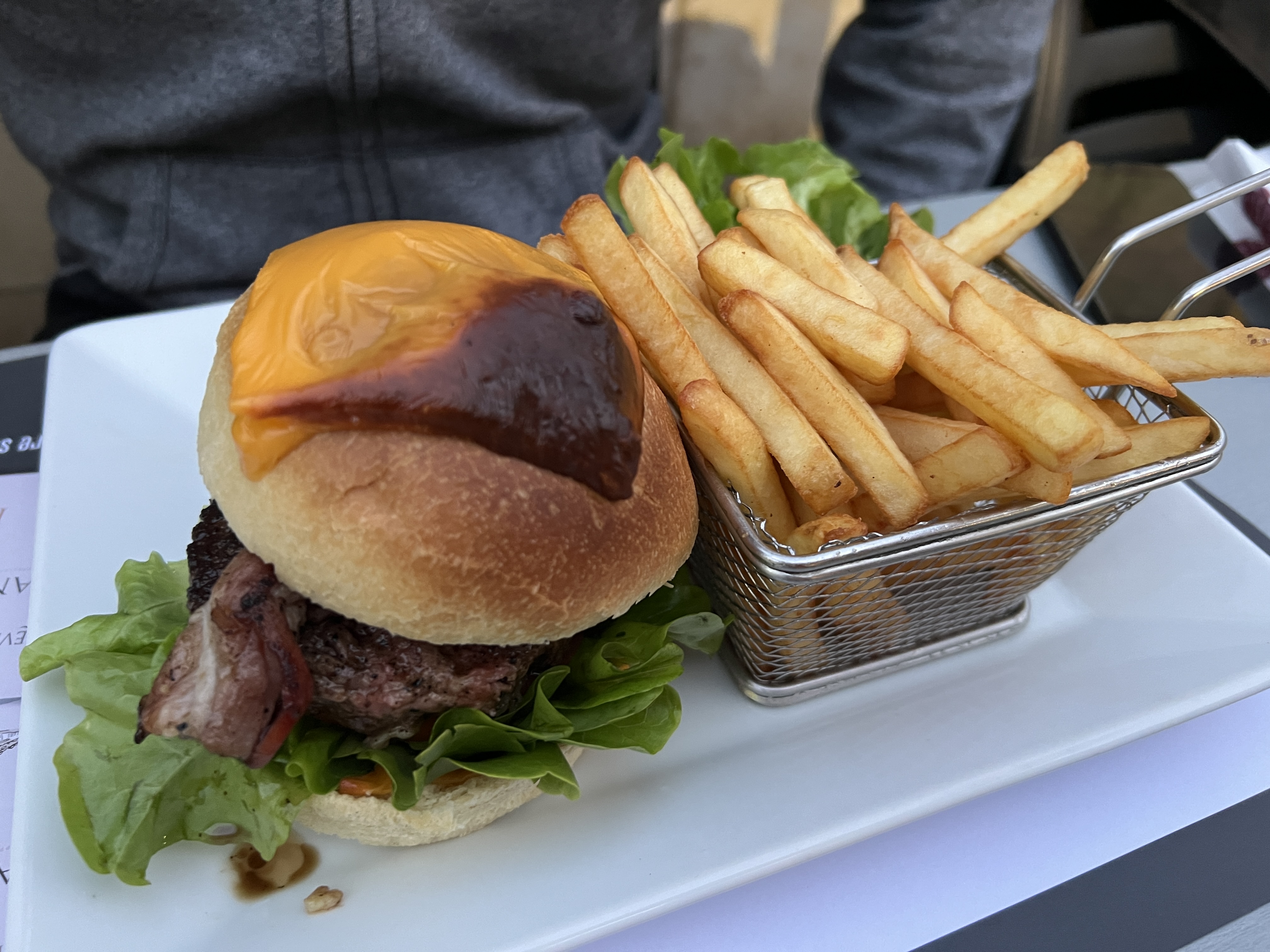 Ce restaurant est une expérience, dans le mauvais sens du terme. Seul restaurant de la ville avec de la place pour 4 à 13h, on sait maintenant pourquoi. Sur 4 plats commandés, un n'était pas le bon servi à table, le burger (en photo) était pas très bon, la viande était cramé a l'extérieur et pas cuite a l'intérieur, les frites carbonisées et froides (un exploit). Nous avons été servis vite, alors que toutes les tables voisines se plaignaient de la lenteur, un plus des plats peu ragoûtant. Nous avons abrégé l'expérience après le plat, le dessert se fera chez un restaurant voisin bien plus accueillant, après une note de plus de 60€ tout de même. Bref, si vous le pouvez, fuyez !
