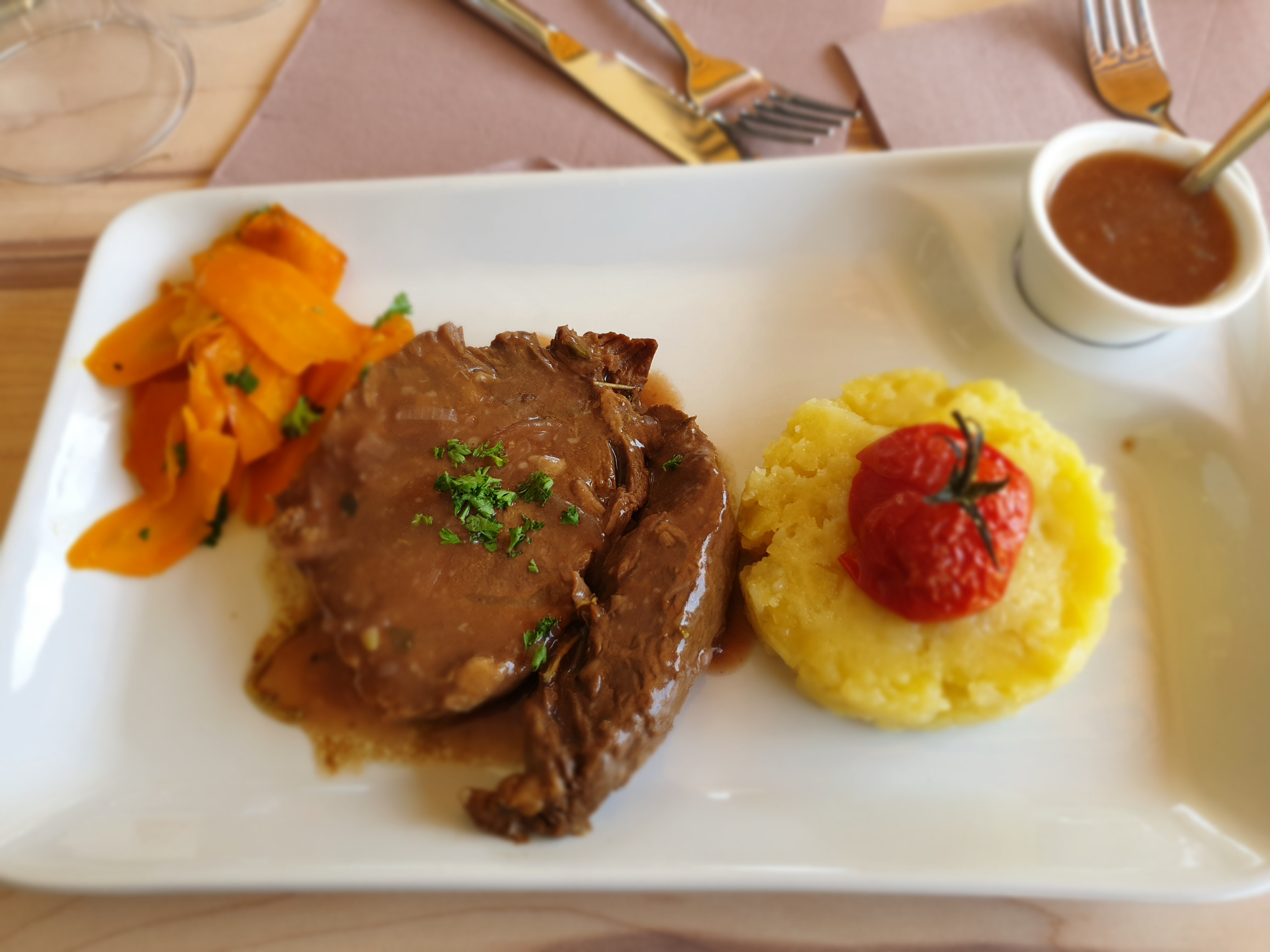 Un accueil au top, enfin un resto qui fait tout maison de A à Z , leur plats cuisinés sont excellents,.j ai pris un fondant de boeuf un délice avec l écrasé de bonne de terre, en dessert clafoutis au framboise, Chantilly maison, j'ai adoré simple et efficace