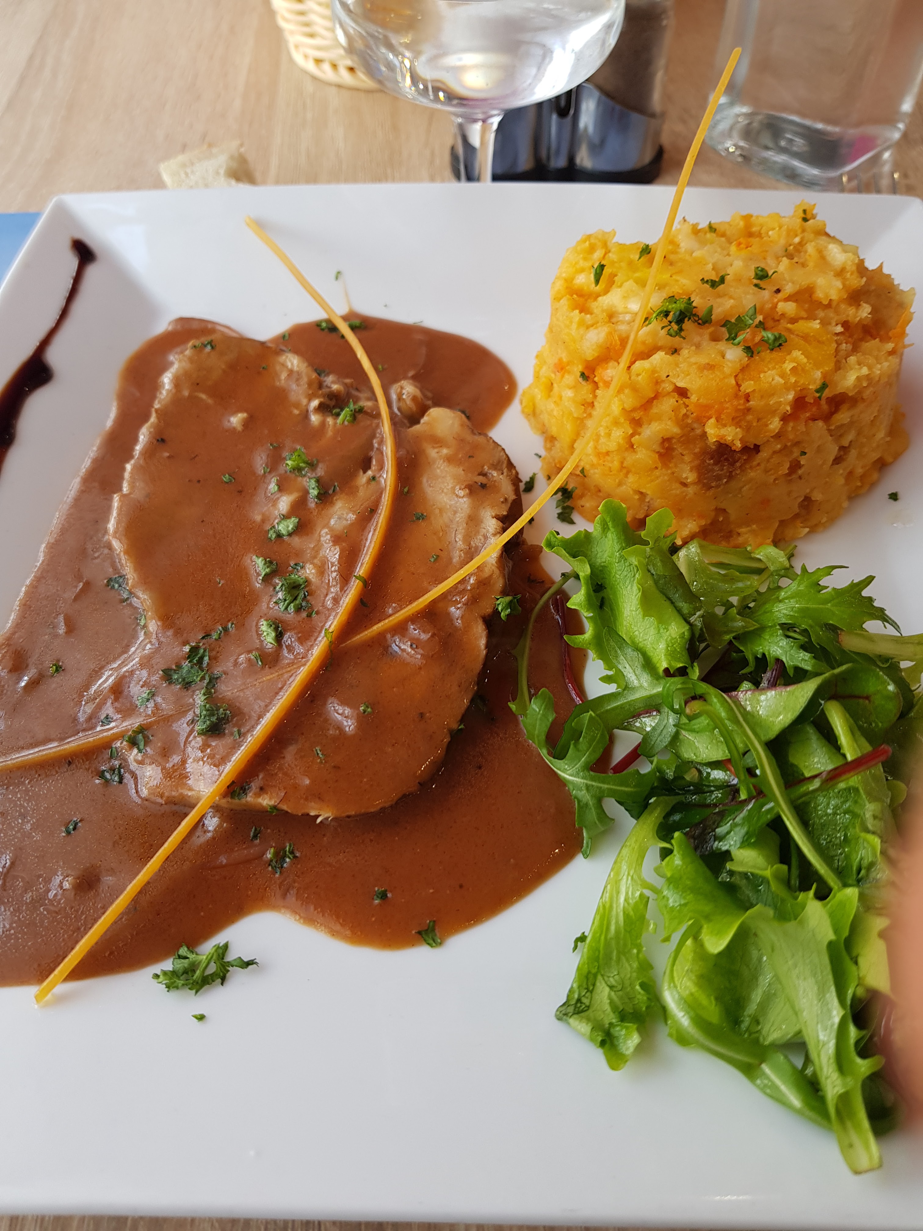 Nous avons déjeuné aujourd’hui dans ce restaurant. Nous sommes arrivés à l’improviste à 14.30, le patron nous a très bien reçu malgré l’heure..Quand les assiettes sont arrivées waouh . Une salade César très complète, et une entrecôte frites, vous me direz rien d’extraordinaire mais deux belles assiettes qui donnent envie. Servie par Madame avec le sourire. Merci ce restaurant mérite d’être connu À bientôt...