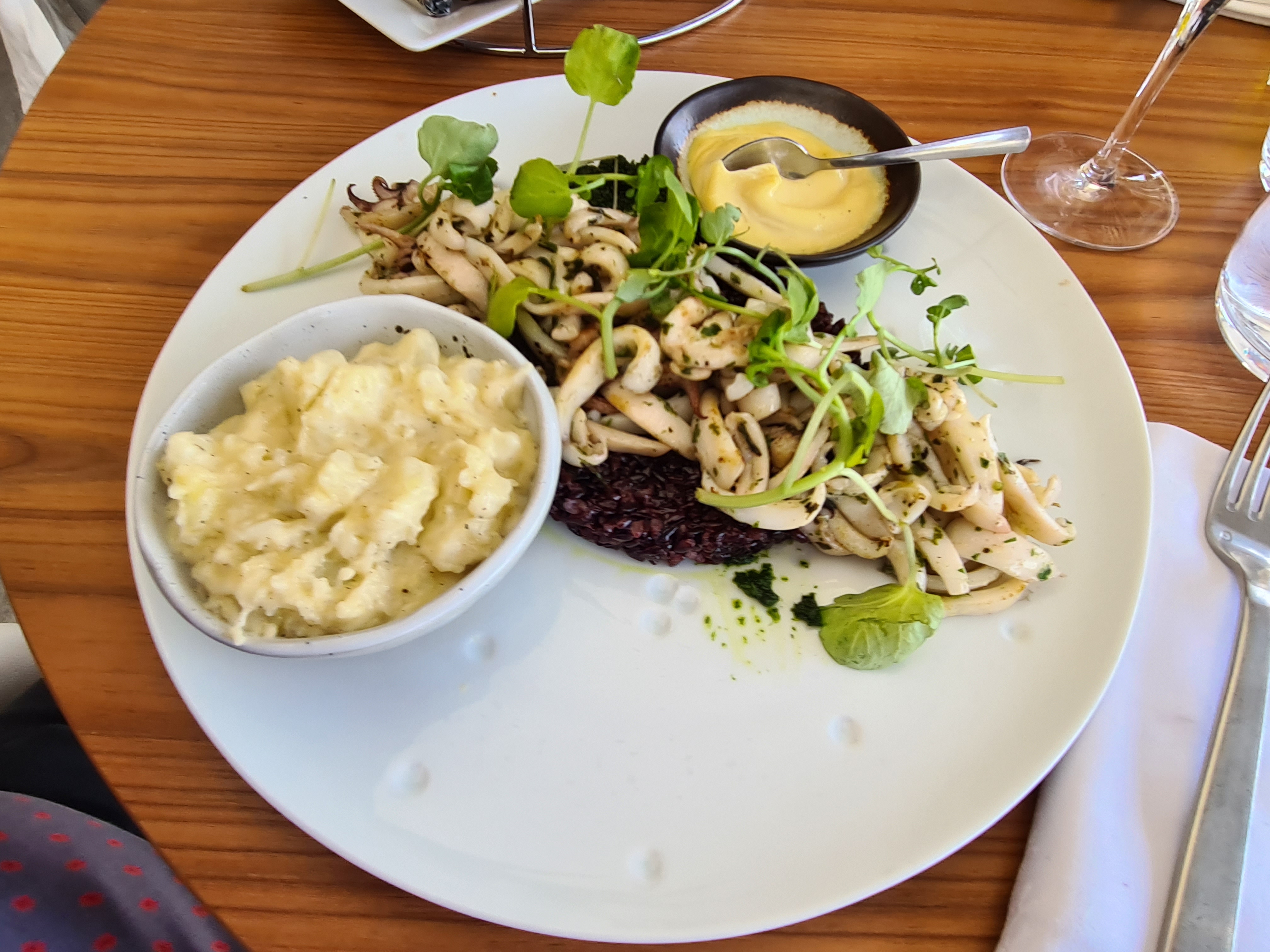 Personnel agréable mais c’est à peu près tout. Nous avons commandé un duo de daurade /lieu et un tartare de saumon mangue avocat. Résultat : Frites surgelées, salade sans sauce, tartare de saumon servi cru sans aucune marinade, riz trop cuits et légumes crus. Un joli endroit mais sans cuisinier à l’intérieur. Si vous venez pour bien manger, passez votre chemin