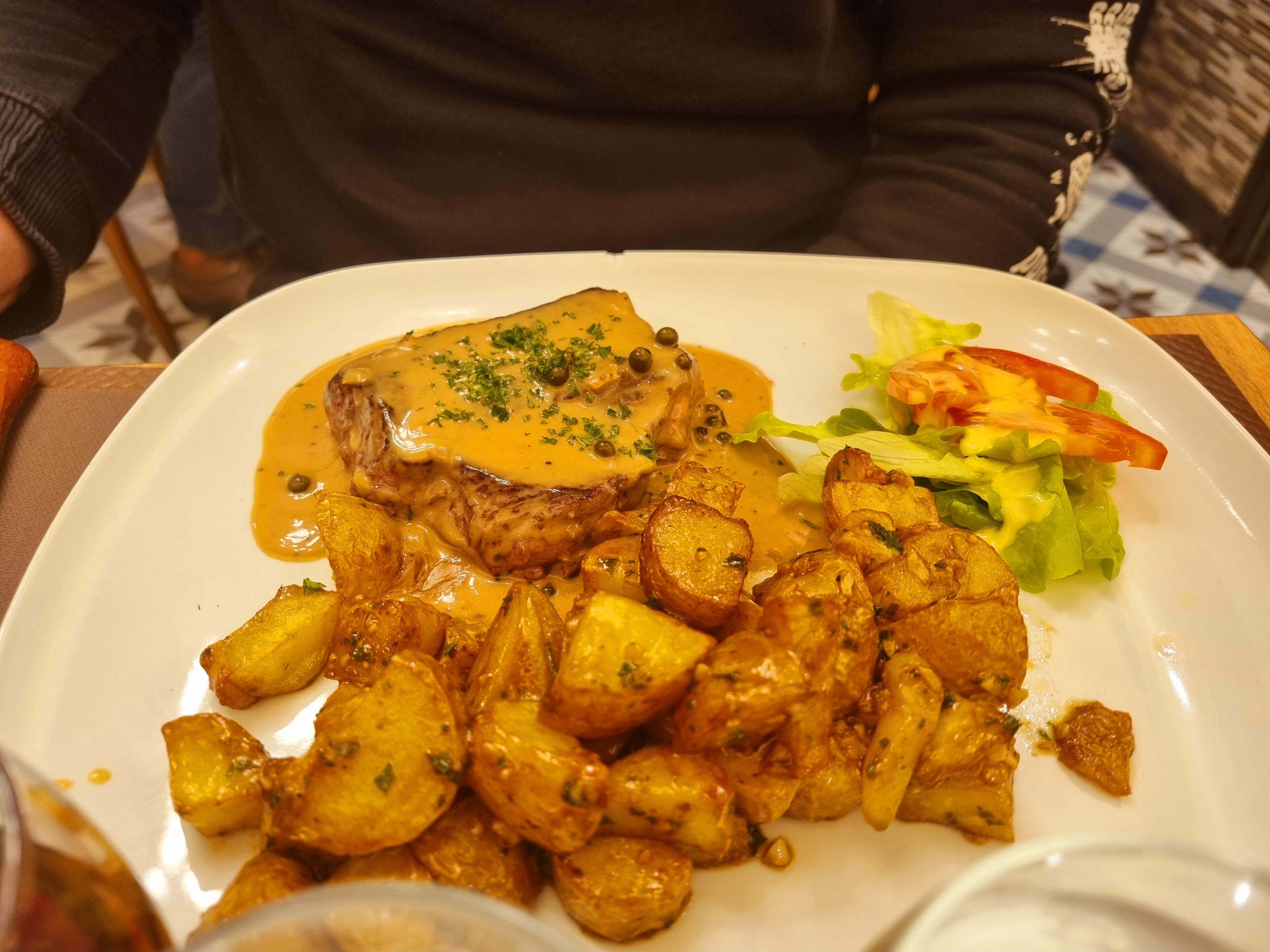 Je suis tellement content de m'être arrêté ici. Le monsieur qui m'a servi a été très patient avec mon français approximatif et a parlé lentement et clairement pour que je comprenne. J'ai commandé l'entrecôte au poivre et MIAM c'était tellement bon. C'était parfaitement cuit et sorti en 10 minutes. Malgré sa proximité avec quelques monuments et musées, cet endroit était rempli de locaux. Un bon steak, un bon vin, un excellent expresso : que demander de plus ?