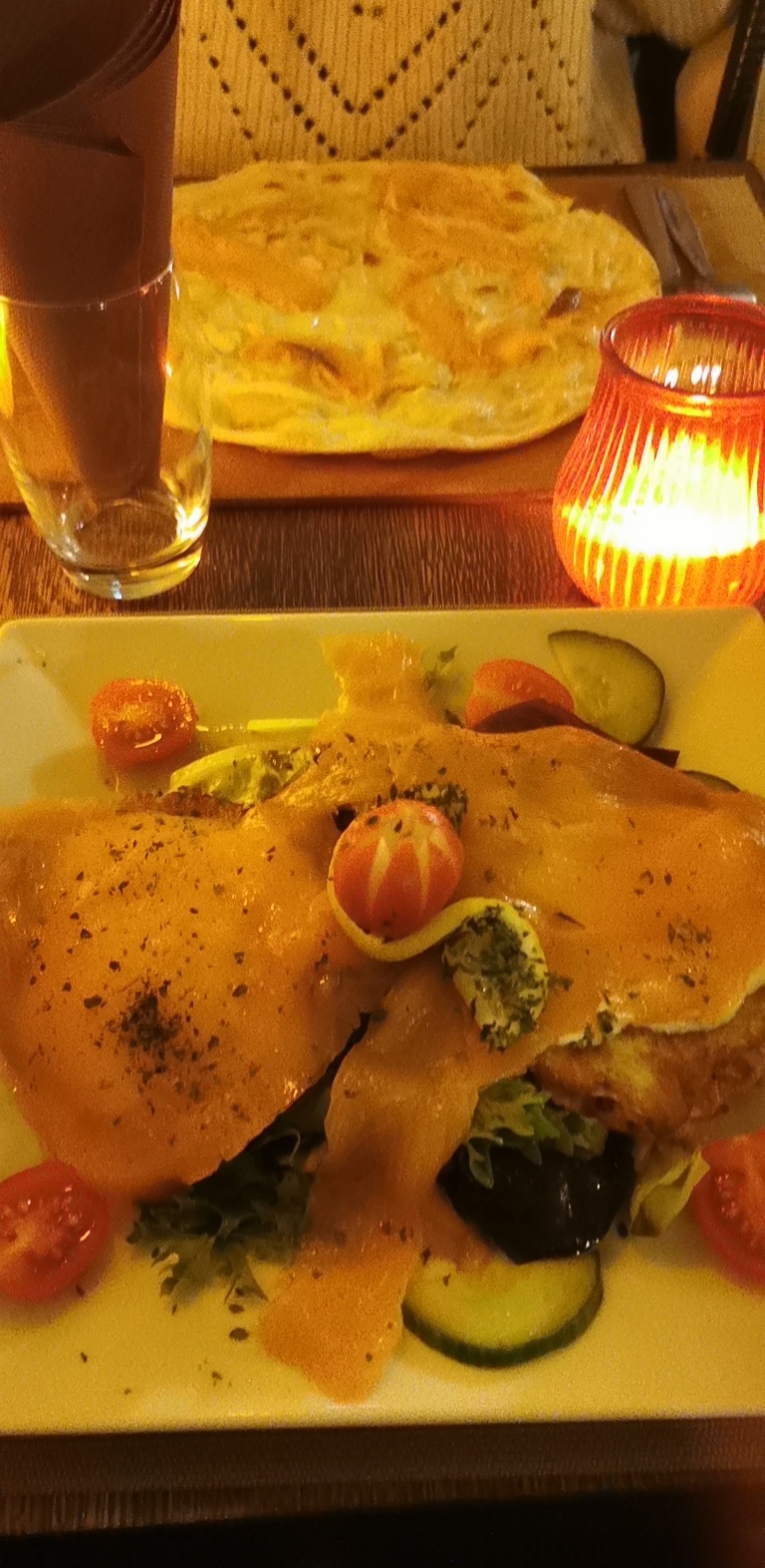 Le serveur était extrêmement sympathique et parlait également allemand. La tarte flambée était très savoureuse. Malheureusement la crêpe était un peu fade avec trop peu de sucre.