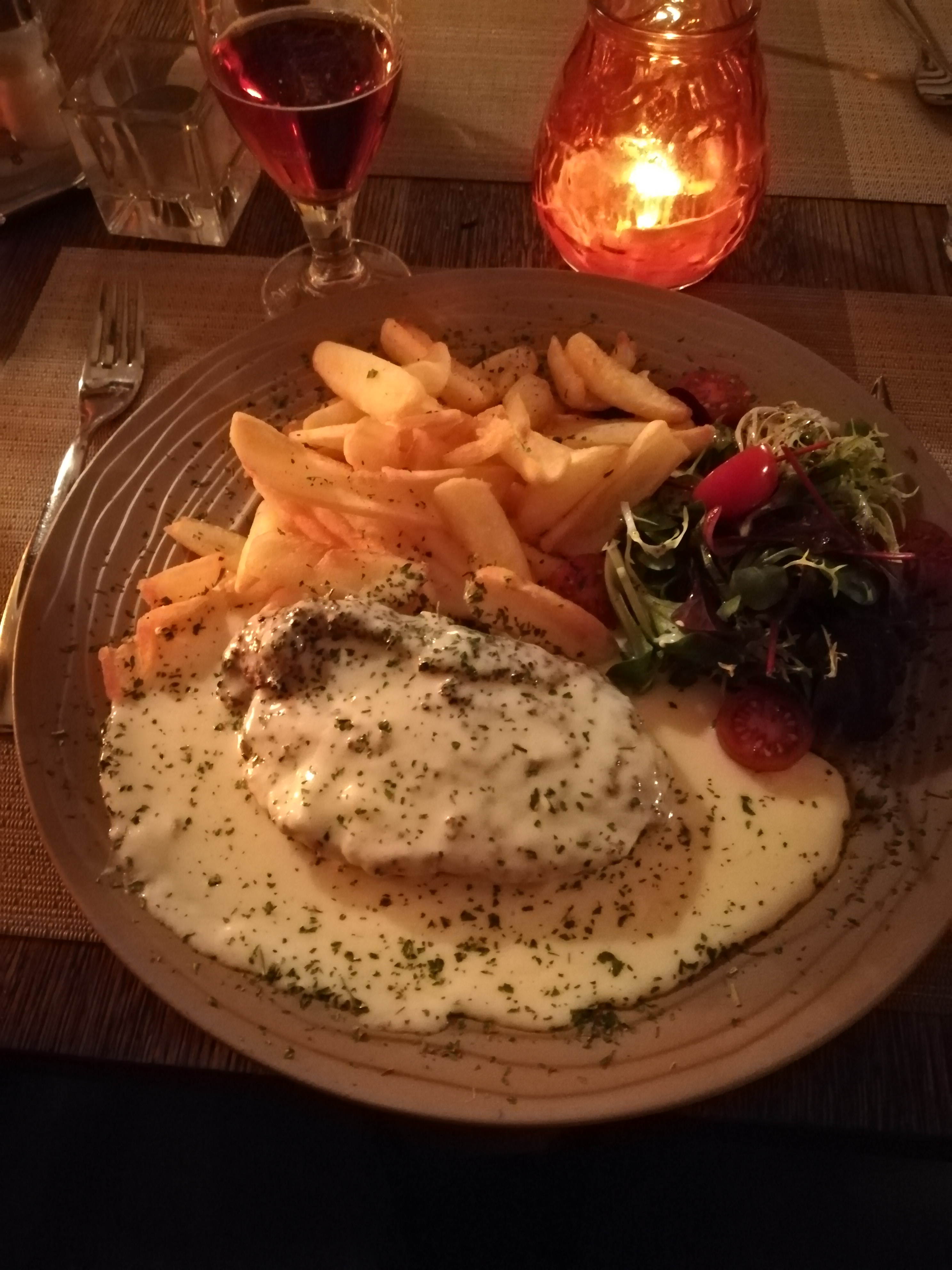Très bon repas, très (trop) copieux comme en témoigne l'image ci-dessous. En ce moment la carte est réduite mais on trouve son bohneur (salades, cordons bleu, escalope, burger...). Les prix sont tout à fait raisonnable pour un restaurant situé au centre ville de Strasbourg. Attention, le restaurant n'accepte pas les tickets restaurants.