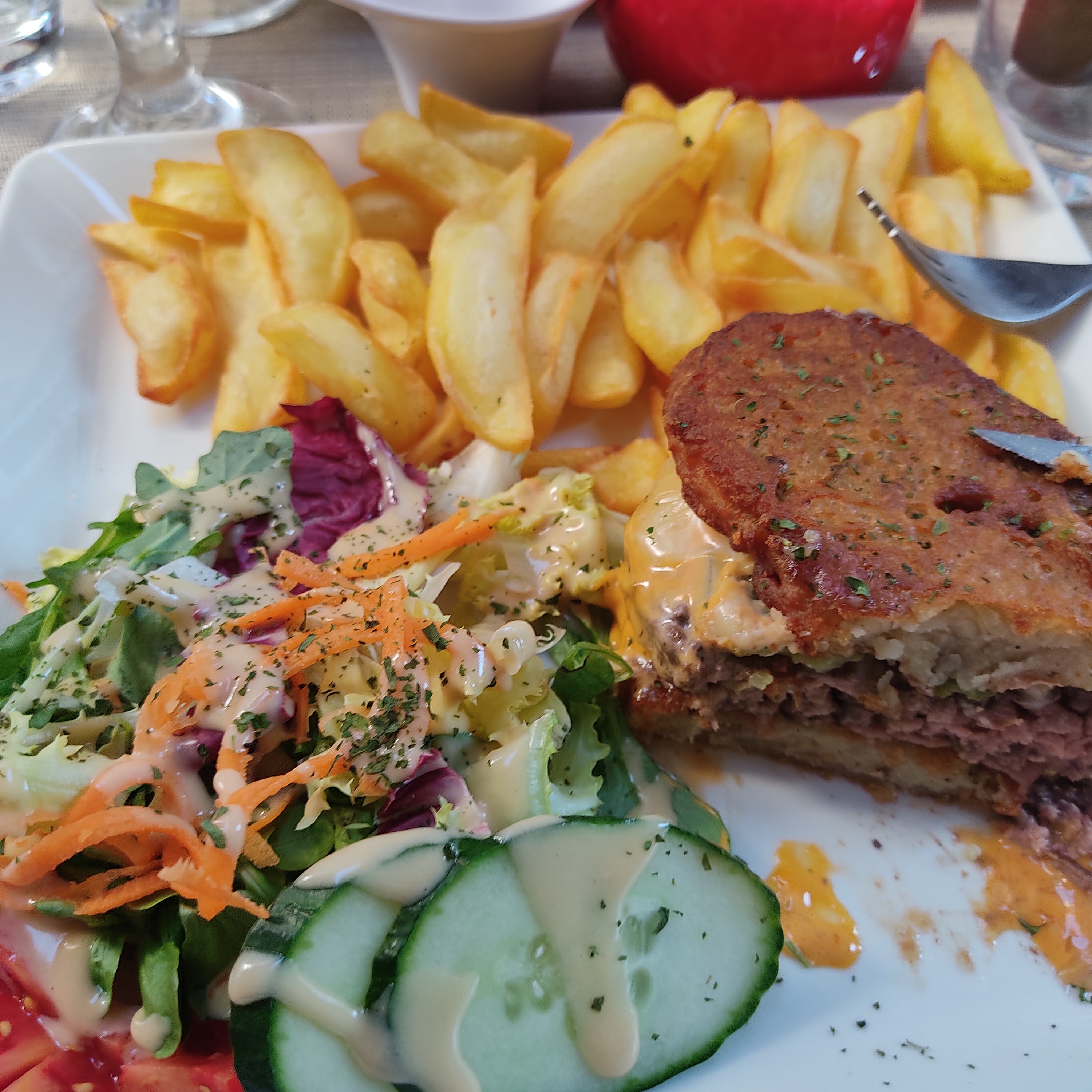L’ambiance est calme, j’ai pris le hamburger alsacien, la galette du dessous toute molle et celle du dessus dure mais ça reste comestible quant au dessert on voit tout de suite que c’est du surgelé et non du fait maison. J’ai été malade toute la nuit je ne recommande pas.