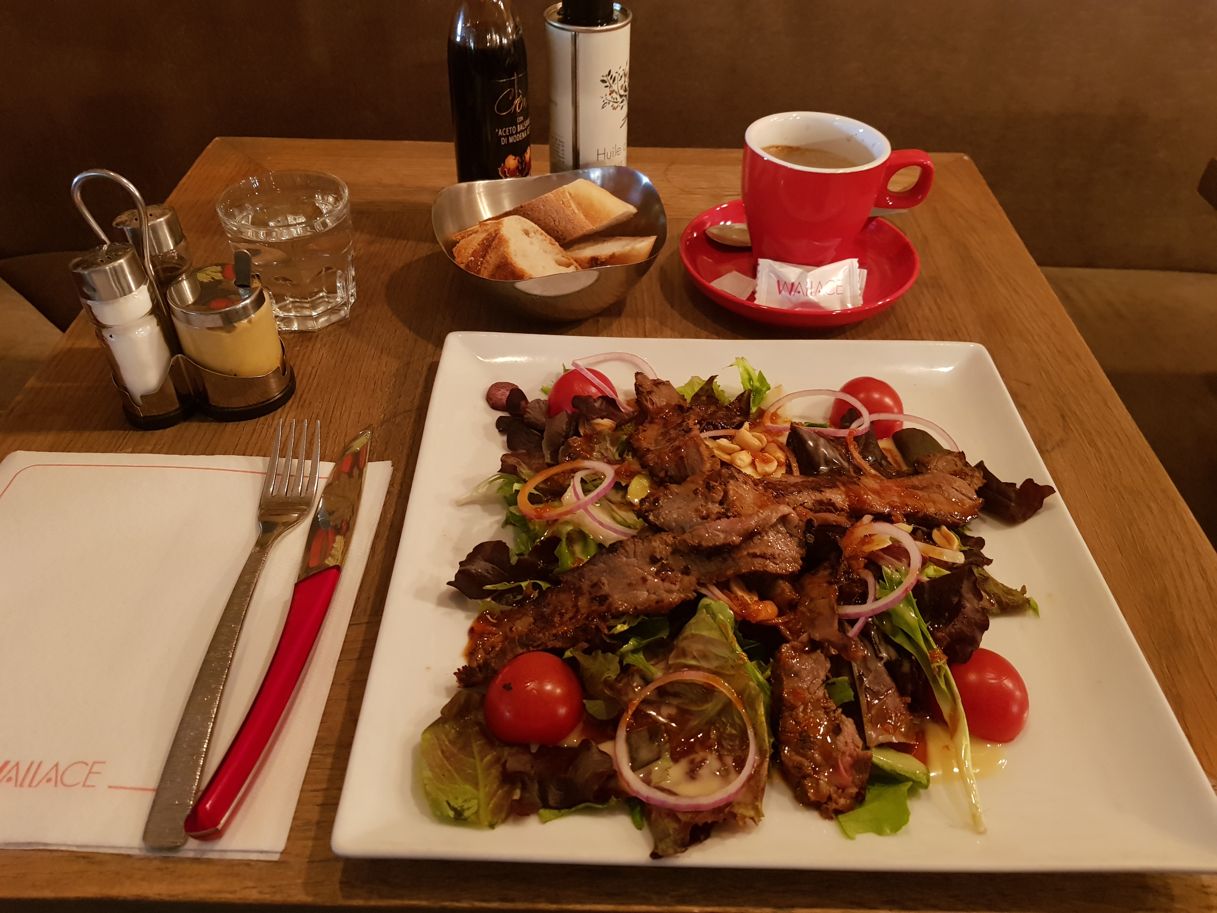 Premier endroit où je me suis arrêté et mangé, si la nourriture parisienne est comme celle-ci, je vais apprécier... ce repas, même s'il s'agissait d'une salade, était l'un des meilleurs au goût et à l'apparence que j'ai eu. Salade de faux-filet façon thaï, cachuètes & oignons rouges.