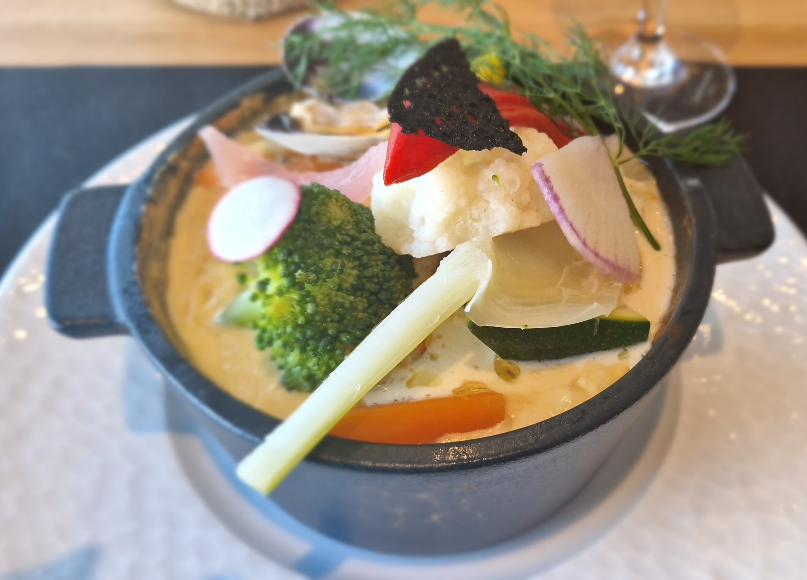 Accueil et service chaleureux et souriant Déjeuner en terrasse très agréable et confortable Service sans attente prolongée Choix à la carte ou menus Nombreux choix du jour sur ardoise Les mets sont parfaits, très frais, de qualité, juste cuit (poisson) craquants à la vapeur pour les légumes Très heureux d'avoir opté pour cette table