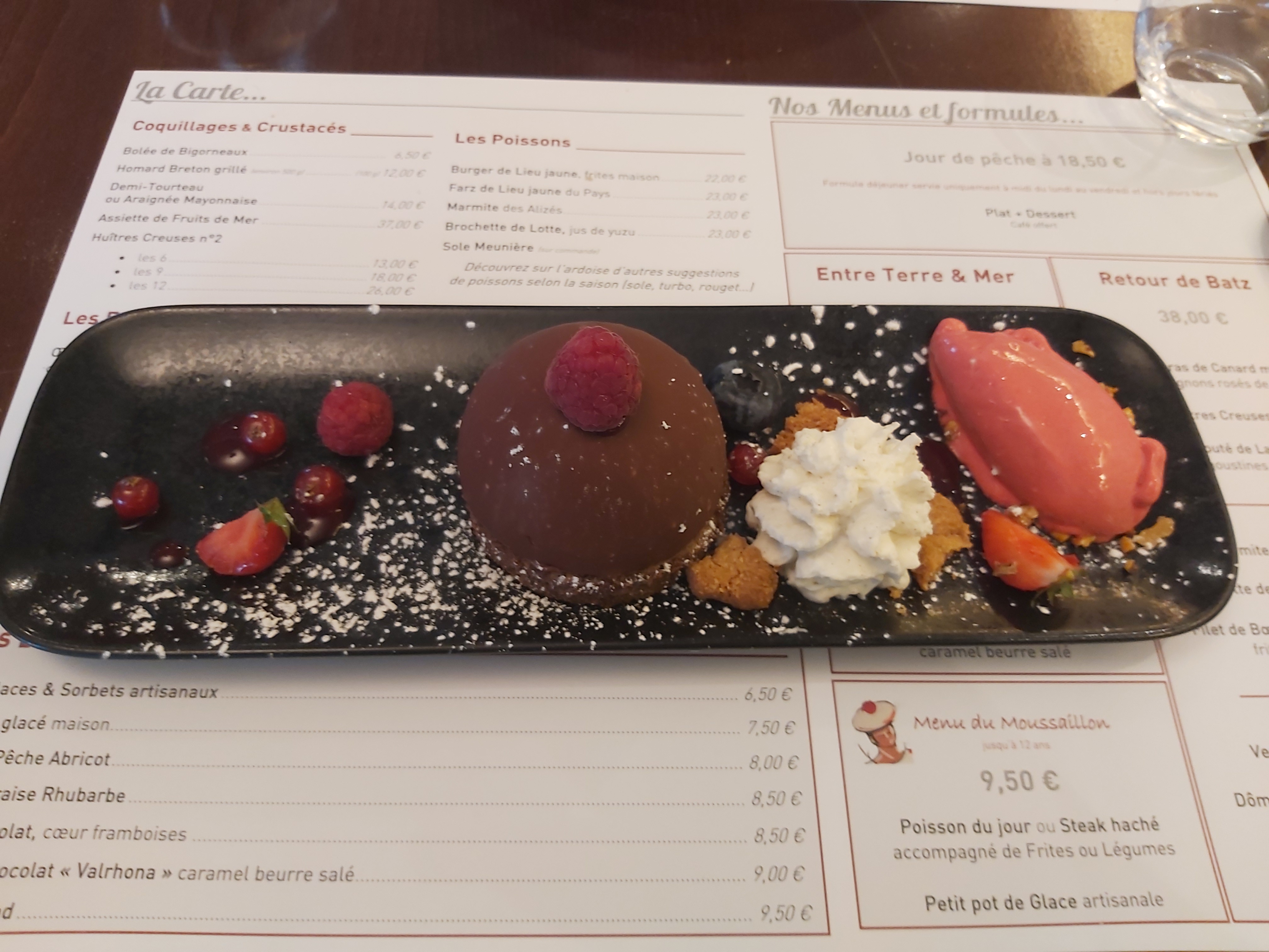 Le menu Retour de Batz est excellent. Le vacherin en dessert est très légé. Un régal!