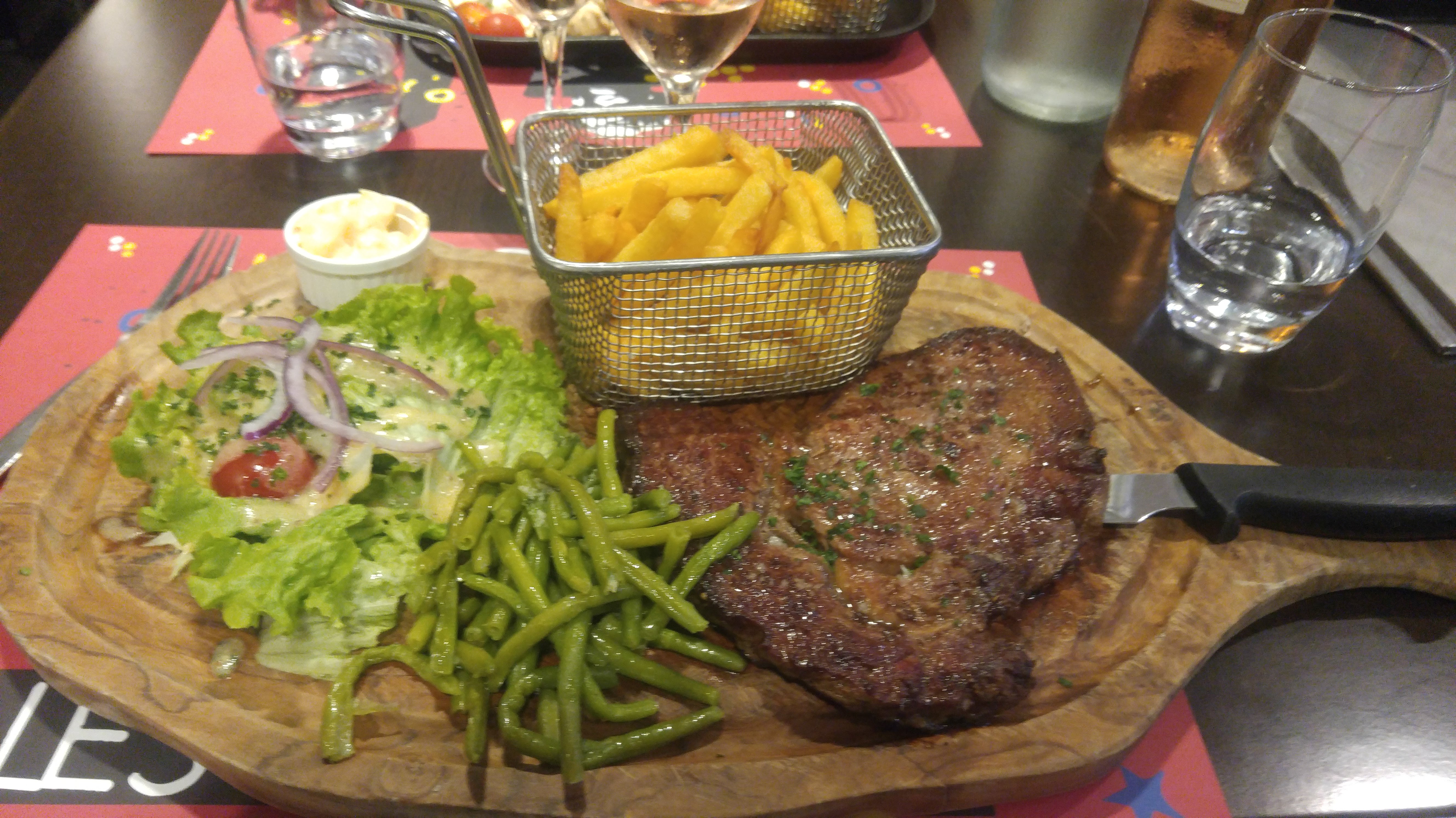 Service sympathique et efficace cadre agréable malgré un aspect extérieur défavorable, viande de qualité exceptionnelle valorisée par une cuisson et une présentation remarquable avec ses frites maison, mêmes avis pour les desserts, à un prix raisonnable, pour qui aime la viande de bœuf, je recommande vivement !