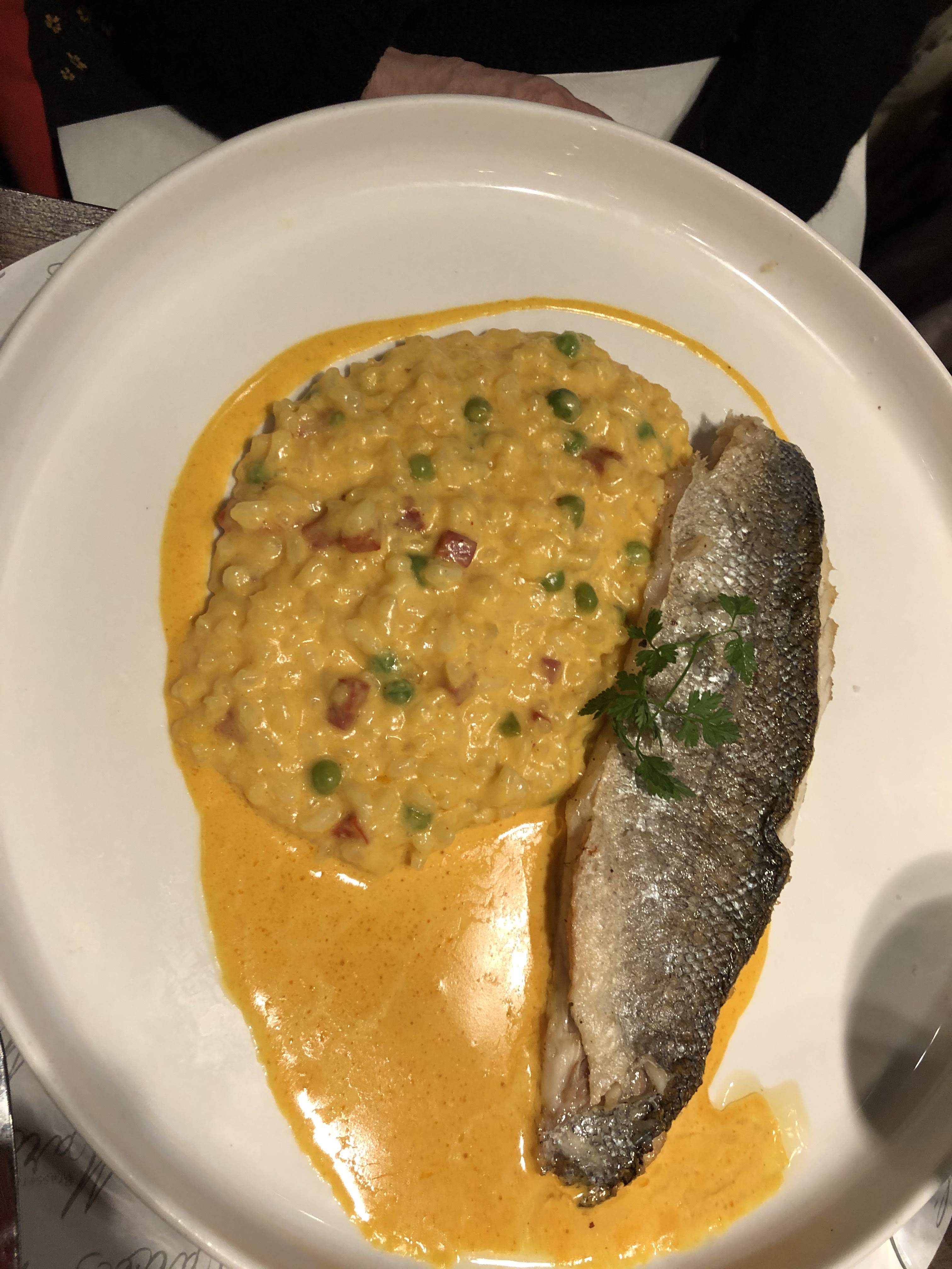 Risotto aux langoustines très bon décor sympathique service classe et agréable ils sont tous en chemise neuf papillon bretelles façon bistrot classe et surtout calme ambiance de fin de journée sympa J'oubliais je recommande évidemment