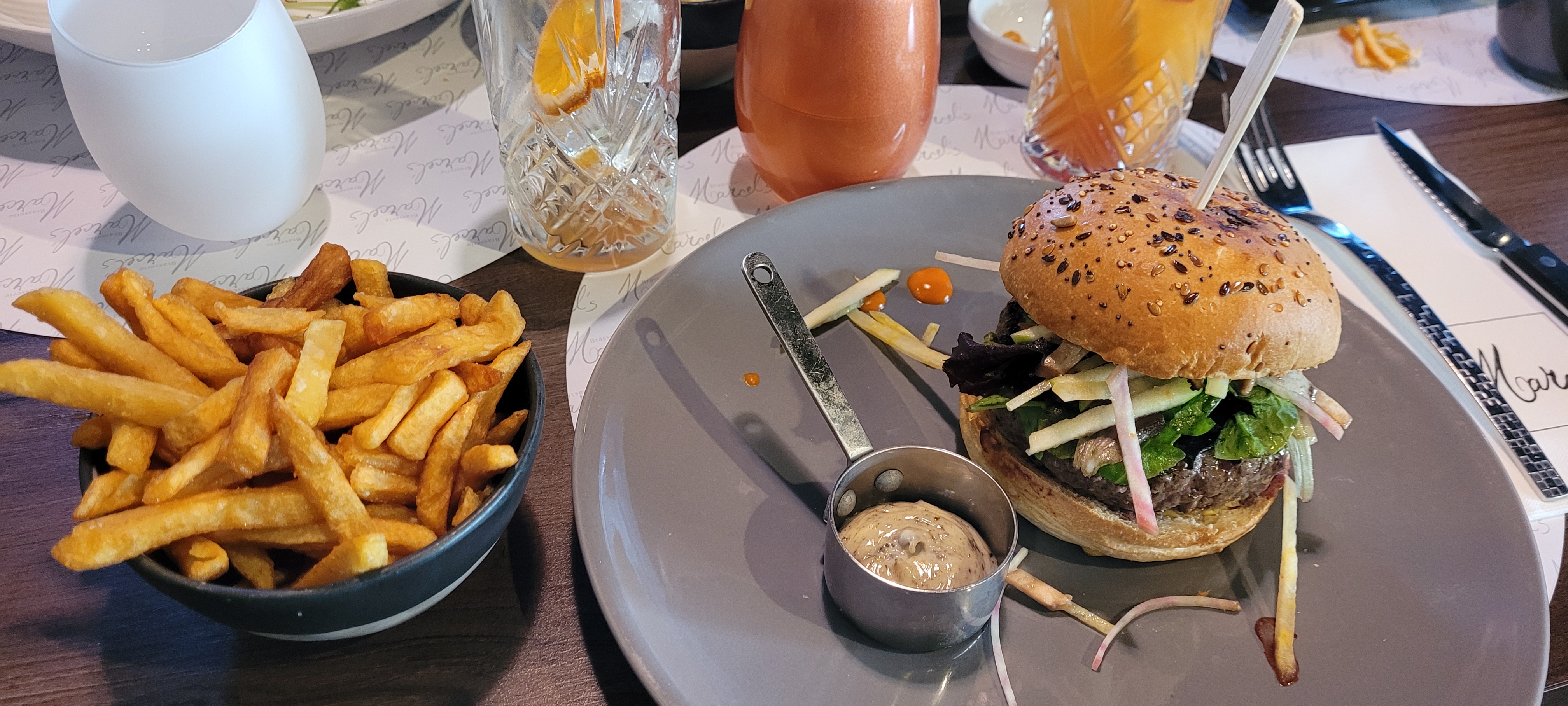 Lieu agreable , peu bruyant Plat juste bon tres peu de choix de burgers, manque de jovialité et de professionalisme chez les serveurs, oublie des sauces (arrivés quand on avait presque fini) zero excuse! nos *burgers maison* qui n'en sont pas (juste une galette avec un steak haché posé dessus et quelques feuilles de salade ainsi que 3 copeaux de parmesans ! Meme pas une sauce et une galette qui le recouvre...) 16euros tres decevant. Nous ne reviendrons pas malheureusement.