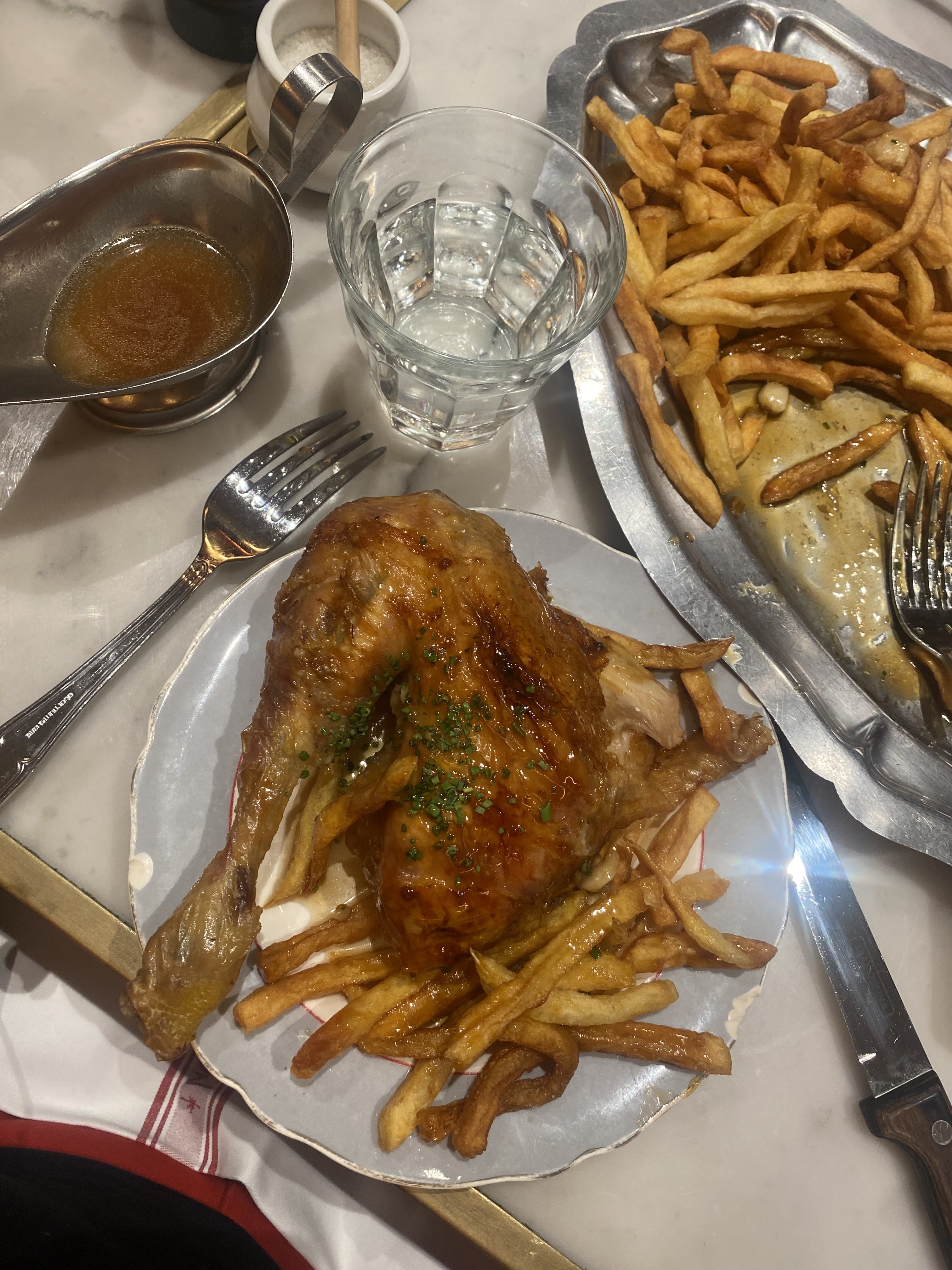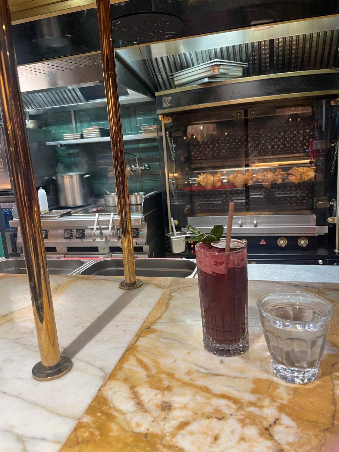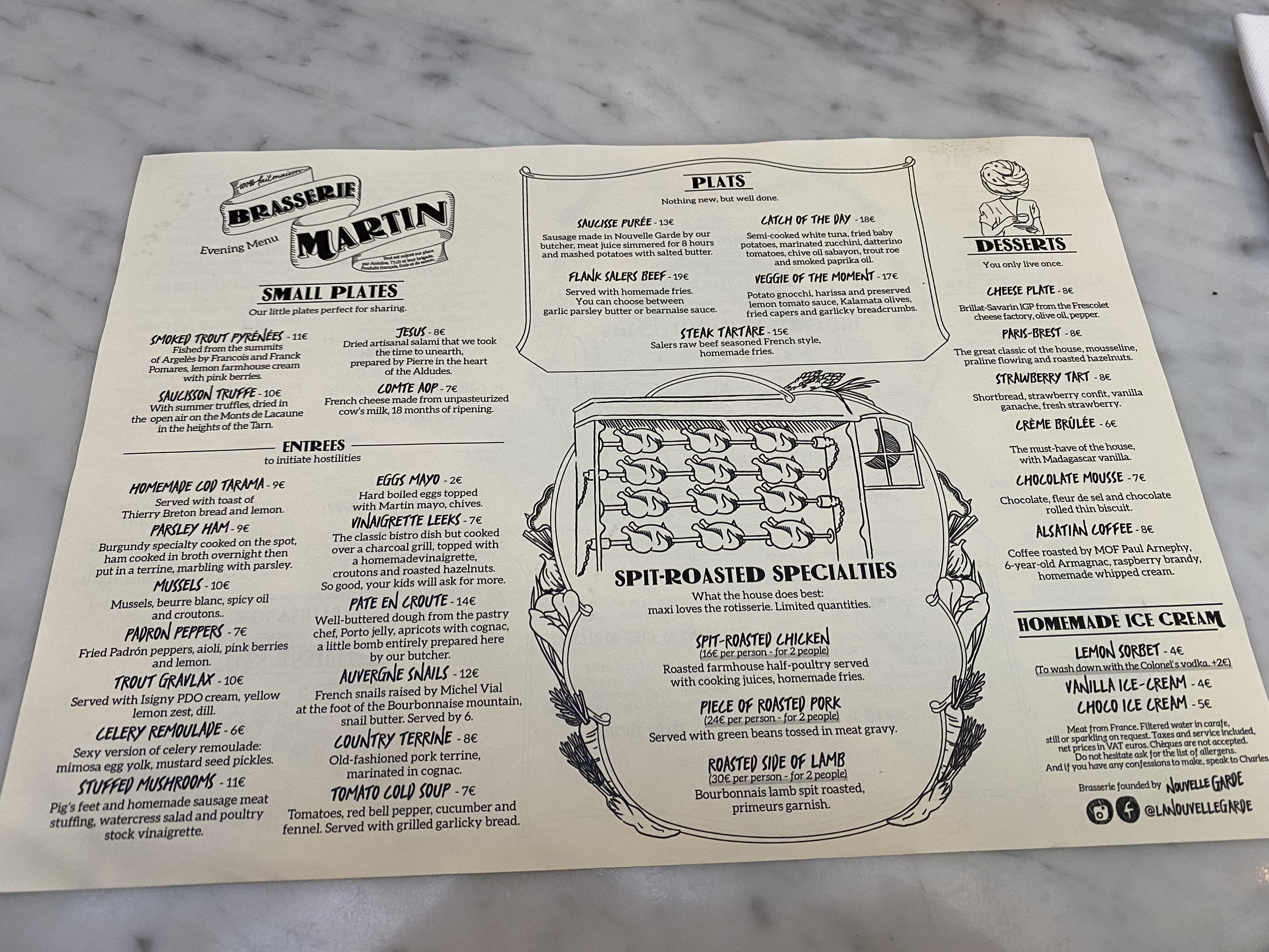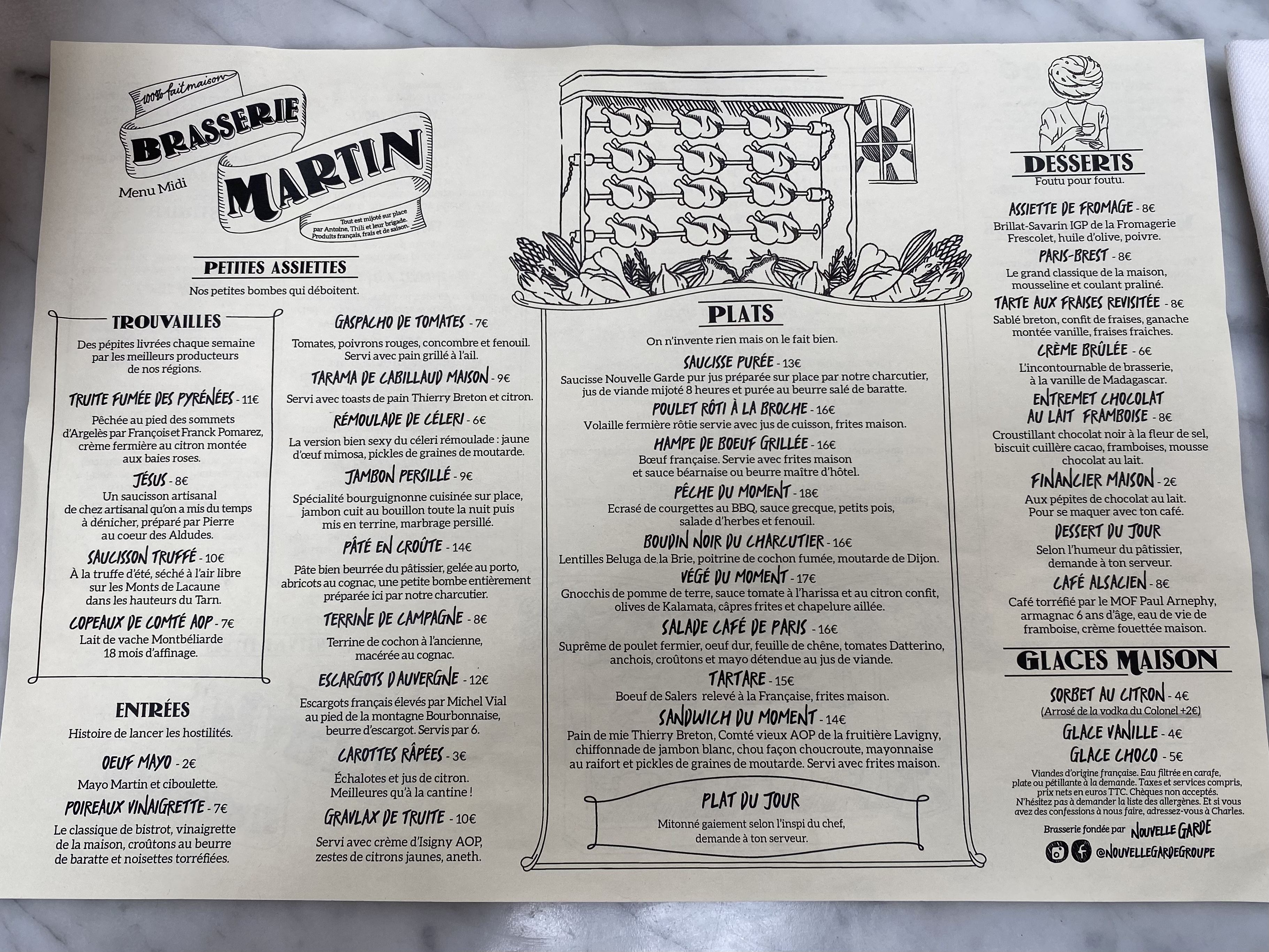 Sans le savoir j'ai reconnu le style Nouvelle Garde aux carafes d'eau et l'organisation du service. Brasserie à l'ancienne, simple rapide. Pas onéreux. Petit bémol sur le beurre d'escargots qui manquait d'assaisonnement. Mais le poulet à la broche très bon, pas sec. Cocktails originaux et sympas. Je recommande.